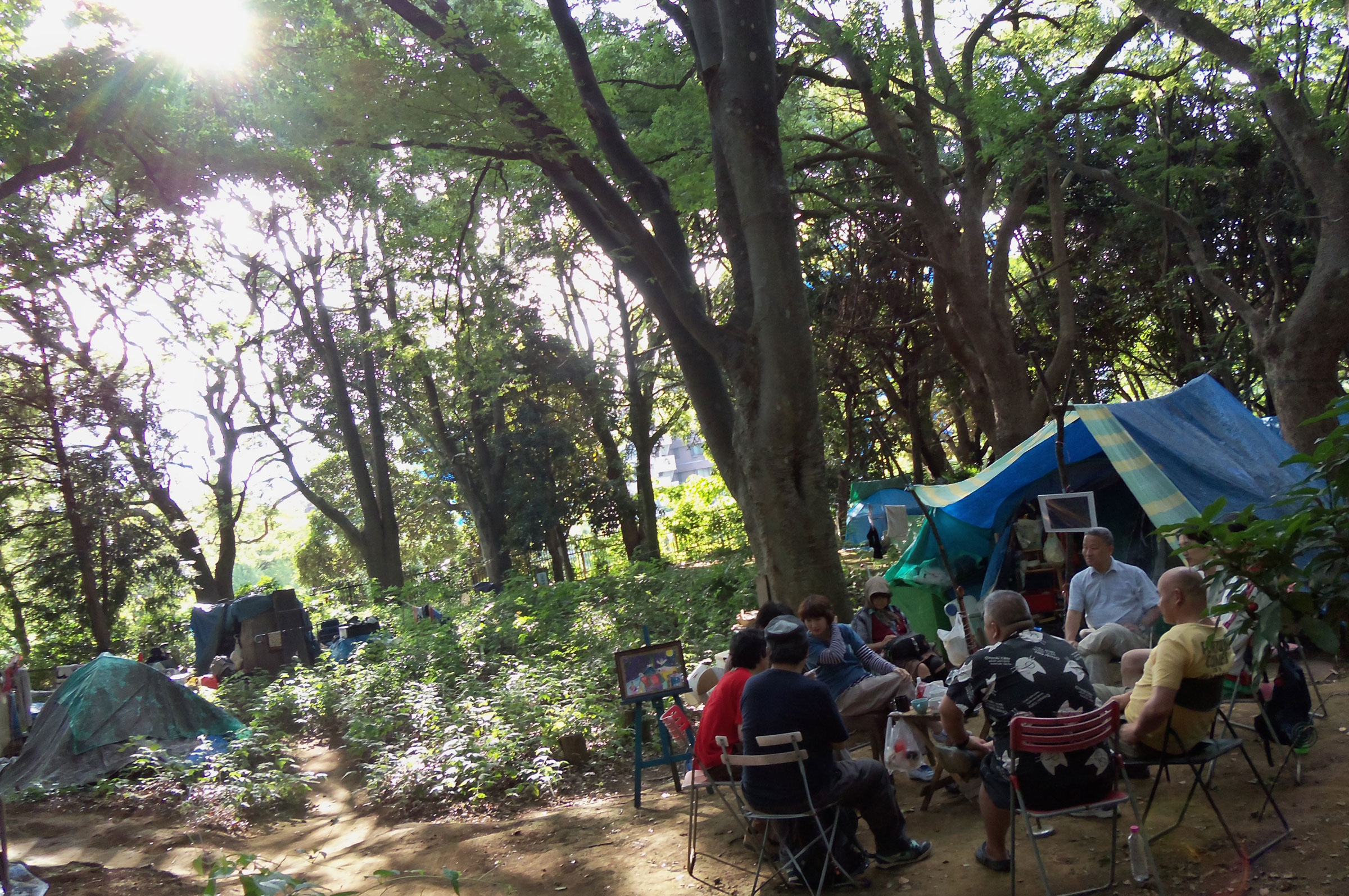 내가 텐트촌을 만난 것은 그때였다. 도쿄의 한가운데에 있는 텐트촌에서는 길에서 매일 대량으로 파기된 사용하지 않는 물건을 모아 서로 교환하며 다양한 궁리를 하며 사는 이들이 있었다. 세계에서 가장 발전한 비즈니스 거리가 있는 도쿄의 한가운데 있는 공원에서 큰 돈을 쓰지 않고도 살아가는 대안 커뮤니티를 실천하고 있던 것이다. 나는 당시 이전에 내가 살던 삶보다도 그들의 삶이 훨씬 살아있다는 것으로 느껴서 이 텐트촌에 뛰어들었다. 지금 되돌아보면, 이곳의 삶을 시작했던 처음에는 보기 좋게 살아남겠다는, 부루퉁한 기분이 컸던 것으로 생각한다. 여기에 자신의 텐트를 세울 수 있었을 때는 고양감과 경계심, 불안이 섞인 것 같은 기분이었다. 물론 텐트촌의 다른 모든 주민이 나와 같은 경험으로 이 삶에 도달한 것은 아닐 것이다. 체력적, 정신적으로 지쳐 목숨만 겨우 유지해 이곳에 온 사람들은 작은 집을 만들고, 남은 음식물과 옷과 물건을 나눠 받아 지내면서 자신의 생활을 일으키는데, 그 과정에서 점점 건강해지는 사람들을 몇이나 만난 적이 있다. 죽으려고 이곳에 왔는데, 돌이켜보면 어떻게 여기에 왔는지 전혀 기억하지 못한다는 이야기를 듣기도 했다. 물론 홈리스들은 복지제도를 받을 권리가 있고, 복지과와 교섭이 잘 되면 생활보호비로 복지시설이나 아파트에서 산다는 선택도 있을 것이다. 그러나 그렇게 돈에 기반을 둔 삶은 건강, 학력, 비장애인, 국적, 성적 취향(이성애자), 나이 조건이 갖춰져 있지 않으면 살기 힘든 입장에 내몰리는 시스템이다. 하지만 이곳은 스스로 창조하는 삶을 영위하고 있다. 텐트촌 주민들은 왜 여기에 왔는가 하는 이유를 말하는 것보다 되도록 여기서 오래 사는 데 관심이 많다.