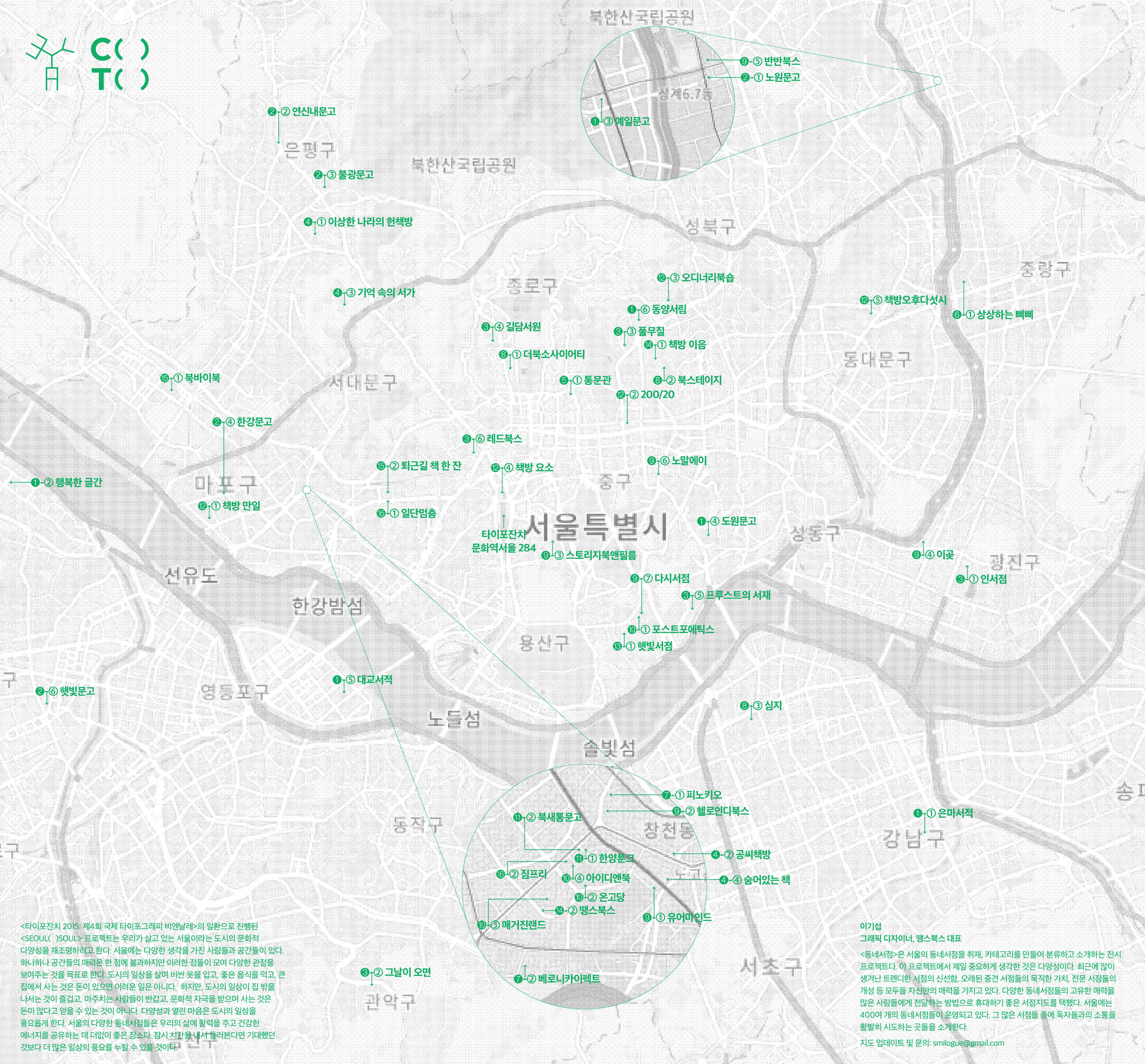 ❶ 30년 이상 지역을 지켜온 서점 ❶-① 은마서적 강남구 삼성로 212 은마아파트(12동) 12 ❶-② 행복한 글간 강서구 강서로 466 우리벤처타운 ❶-③ 예일문고 도봉구 노해로63길 84-3 ❶-④ 도원문고 성동구 독서당로 294 ❶-⑤ 대교서적 영등포구 국제금융로7길 20 대교상가 ❶-⑥ 동양서림 종로구 창경궁로 271-1 ❷ 90년대 시작해 지금까지 독자들과 소통하는 서점 ❷-① 노원문고 서울특별시 노원구 동일로 1390 상계주공아파트 ❷-② 연신내문고 은평구 통일로 861 ❷-③ 불광문고 은평구 통일로 742 대한생명 ❷-④ 한강문고 마포구 월드컵로 125 ❷-⑤ 홍익문고 서대문구 연세로2 홍익문고 ❷-⑥ 햇빛문고 양천구 목동서로 355 ❸ 사회, 문화과학 서점 ❸-① 인서점 광진구 광나루로24길 14 ❸-② 그날이 오면 관악구 신림로89 ❸-③ 풀무질 종로구 성균관로19 ❸-④ 길담서원 종로구 자하문로17길 12-9 ❸-⑤ 프루스트의 서재 성동구 무수막길56 ❸-⑥ 레드북스 종로구 통일로 150-1 ❹ 헌책방 ❹-① 이상한 나라의 헌책방 은평구 서오릉로18 ❹-② 공씨책방 서대문구 신촌로51 ❹-③ 기억 속의 서가 서대문구 연희로가길41 ❹-④ 숨어있는 책 마포구 신촌로12길 30 ❺ 고서점 ❺-① 통문관 종로구 인사동길 55-1 ❻ 어린이 서점 ❻-① 상상하는 삐삐 중랑구 중랑천로117 정광빌딩 ❼ 그림책 서점 ❼-① 피노키오 마포구 성미산로 194-11 ❼-② 베로니카이펙트 마포구 어울마당로2길 10 ❽ 예술 서점 ❽-① 더북소사이어티 종로구 자하문로10길 22 ❽-② 북스테이지 종로구 대학로10길 17 ❽-③ 심지 강남구 논현로 723 창성빌딩 ❾ 독립출판물 서점 ❾-① 유어마인드 마포구 와우산로35길 70 ❾-② 헬로인디북스 마포구 동교로46길 33 ❾-③ 스토리지북앤필름 용산구 신흥로 115-1 ❾-④ 이곶 성동구 광나루로9길 2 ❾-⑤ 반반북스 노원구 동일로 1456 ❾-⑥ 노말에이 중구 장충단로7길 17 2층 ❾-⑦ 다시서점 서울 용산구 이태원로42길 34 지하 1층 ❿ 해외출판물 서점 ❿-① 포스트포에틱스 용산구 이태원로240 3층 ❿-② 온고당 마포구 와우산로105 ❿-③ 매거진랜드 마포구 잔다리로6길 17 ❿-④ 아이디앤북 마포구 어울마당로 136-3 ⓫ 만화 서점 ⓫-① 한양툰크 마포구 홍익로6길 67 ⓫-② 북새통문고 마포구 홍익로6길 57 금강빌딩 ⓬ 작은 복합 서점 ⓬-① 책방 만일 마포구 희우정로16길 46 ⓬-② 200/20 중구 청계천로160 청계상가 가열 311호 ⓬-③ 오디너리북숍 성북구 성북로6가길 1 ⓬-④ 책방 요소 중구 청파로 437-1 ⓬-⑤ 책방오후다섯시 동대문구 회기로26길 14 3층 ⓭ 퀴어 서점 ⓭-① 햇빛서점 용산구 보광동 우사단로10길 84 ⓮ 전시가 있는 서점 ⓮-① 책방 이음 종로구 대학로14길 12-1 ⓮-② 땡스북스 마포구 잔다리로28 ⓯ 술이 있는 서점 ⓯-① 북바이북 마포구 월드컵북로44길 32 (소설점) ⓯-② 퇴근길 책 한 잔 마포구 숭문길206 ⓰ 여행 서점 ⓰-① 일단멈춤 마포구 숭문16가길 9 ⓰-② 짐프리 마포구 양화로156 LG팰리스빌딩 지하 2층 222호
