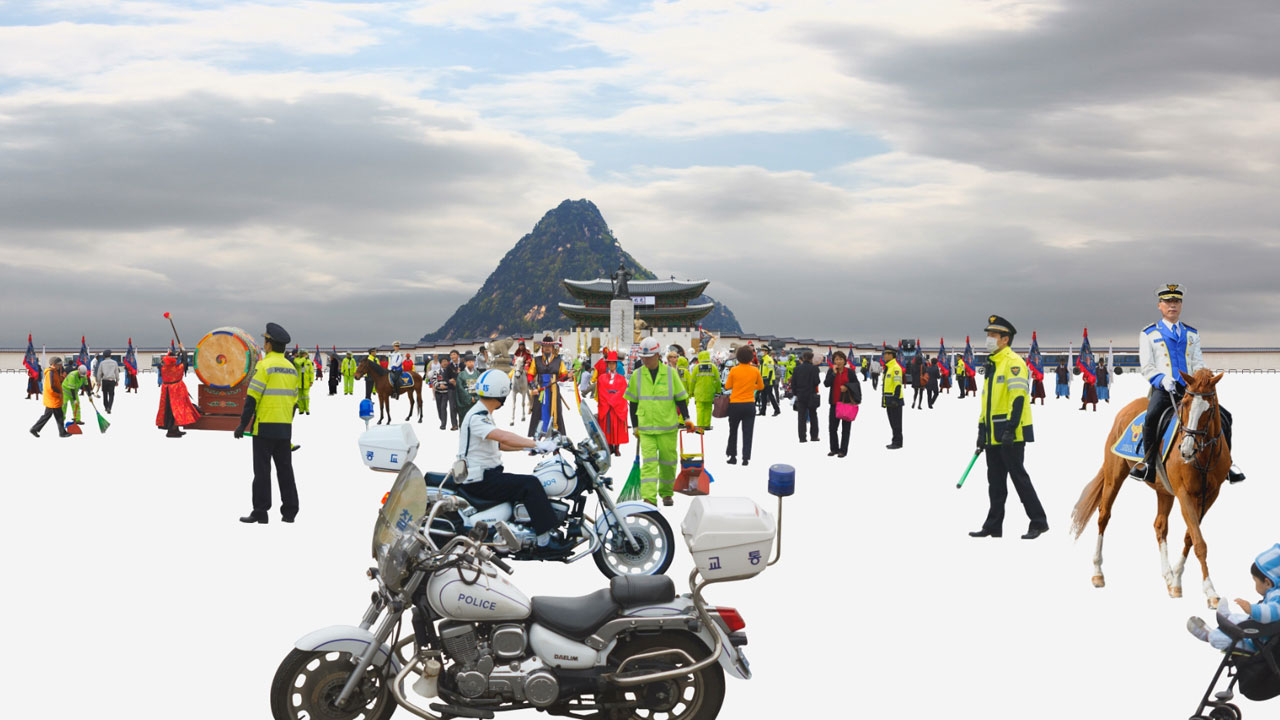 진하게 발광發光하며 움직이는 형광색 빛들이 보인다. 오전 11시 20분, 광화문 네거리의 신호등이 붉게 물드는 순간 ‘그들은’기다렸다는 듯이 도로를 점령, 그리고 통제한다. 5차선의 콘크리트 도로가 텅 비어지고 조선시대 의복을 입은 행렬 연기자들이 거리로 들어선다. 흙 위로 두껍게 깔린 콘크리트 도로와 양 옆을 지키고 있는 높은 빌딩 마천루를 배경 삼아 약 1,000여 명의 긴 행렬이 시작된다. 어제까지만해도 승마코스에서 달렸을 법한 말들과 기수들이, 오늘은 장군복을 입고 광화문 도로를 코스 삼아 거리를 행진하고 있다. 무거워 보이는 왕의 어령이 등장하고 어령을 옮기는 일꾼들을 쳐다보지만 힘겨운 내색하나 없는 걸 보아 힘 꽤나 쓰는가 싶다. 하지만, 그 사람들의 발 주변으로 시선을 옮기니 마차에서 아래로 늘어진 천들의 틈 사이로 튼실한 바퀴가 잘도 굴러 가고 있다.