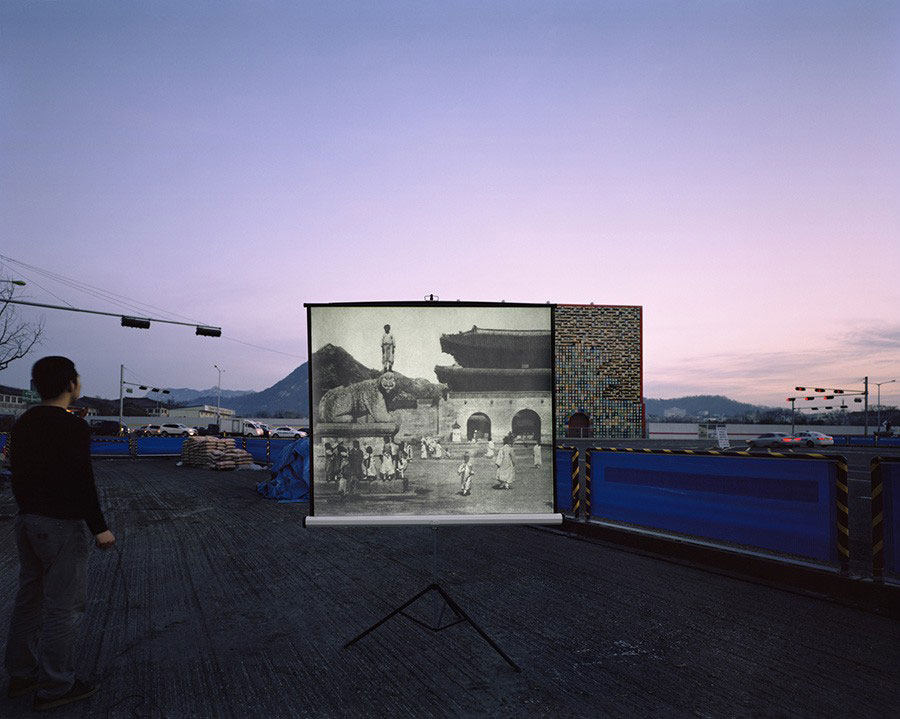 <사적 현재historic present> 사진 연작에 등장하는 광화문은 서울이라는 낯선 장소의 탐구, 야외 영사 테스트와 의미 연구, 순수한 호기심에서의 과거로의 여행, 시각의 몽타주 등을 실천해보며 사진 탐구와 현실 기록에 중점을 두고 작업했다. 그리고 광화문 광장이 만들어지기 이전 모습들, 바닥의 콘크리트를 한 꺼풀 벗겨낸 상태, 변함없는 북악산의 위치와 형태, 흑백사진 속 흙먼지가 날리는 바닥, 100m 옮겨진 해태상의 위치, 콘크리트 광화문의 공사 현장 등을 확인할 수 있었다.
