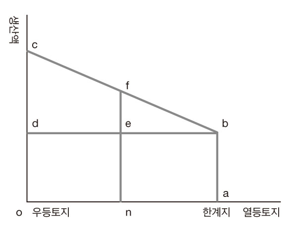 처음에 토지 사용에 대한 대가가 없었다고 하더라도 생산자들 간의 경쟁 때문에 점점 그 값은 올라간다. 어디까지 올라갈까? ‘그 토지의 생산액 – 한계지 생산액’까지다. 지대가 이 수준에 도달하면 초과 수익은 사라진다. 만일 지대가 그보다 더 높이 올라가면, 생산자는 다른 토지에서 생산하는 편이 낫다고 여겨서 더 이상 그 토지를 사용하려고 하지 않는다. 결국 지대는 그 토지의 생산액과 한계지 생산액의 차이로 결정된다. 예를 들어 토지 n에서는 생산액이 nf인데 그것은 지대 ef와 ‘임금+이자’ ne로 분배된다. 각 토지 단위에서 분배가 어떻게 이루어지는지 확인한 후에, 지대는 지대끼리 합하고 ‘임금+이자’는 ‘임금+이자’끼리 합하면 경제 전체의 총생산액이 어떻게 분배되는지도 알 수 있다. 즉, 경제 전체의 총생산액 oabc는 총지대 bcd와 ‘임금+이자’의 총액 oabd로 분배된다.5