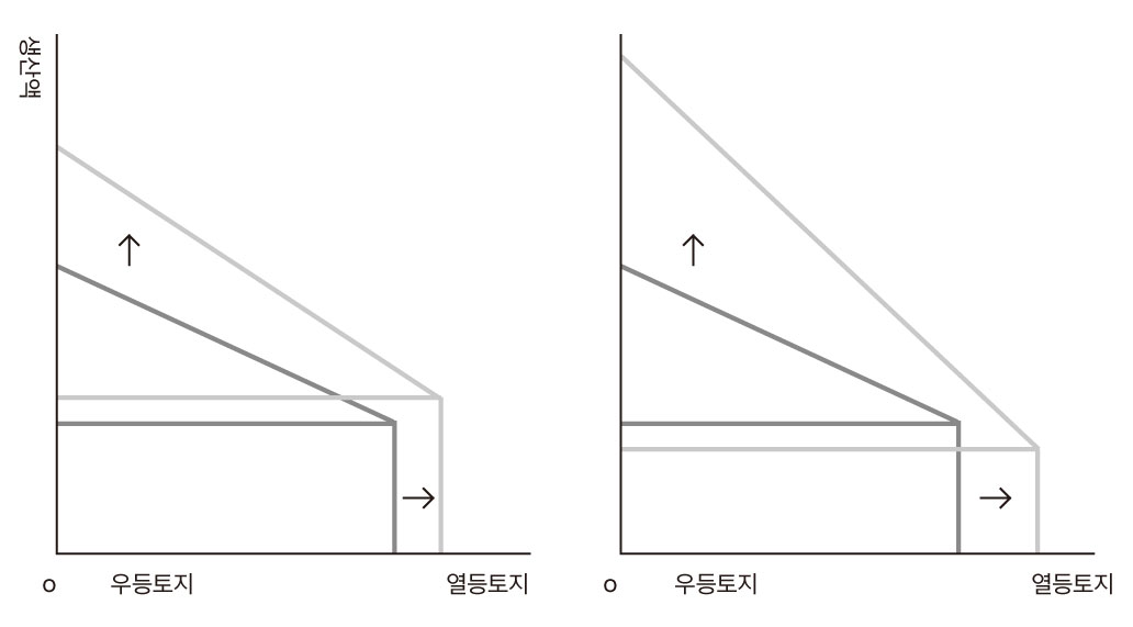 [그림2]는 위에서 말한 두 가지 현상이 어떤 결과를 초래할지 보여주는 그래프다.7 두 그래프의 차이는 한계지가 밖으로 밀려나는 정도가 다르다는 점이다. 한계지가 조금 밀려나건 많이 밀려나건, 인구 증가가 초래하는 분배의 변화는 지대의 비중이 올라가는 반면 ‘임금+이자’의 비중은 하락하는 방향으로 진행된다는 것을 확인할 수 있다. 땅을 가진 사람과 갖지 못한 사람 사이에 불평등이 심해지고 그 와중에 빈곤이 심화되는 것이다.