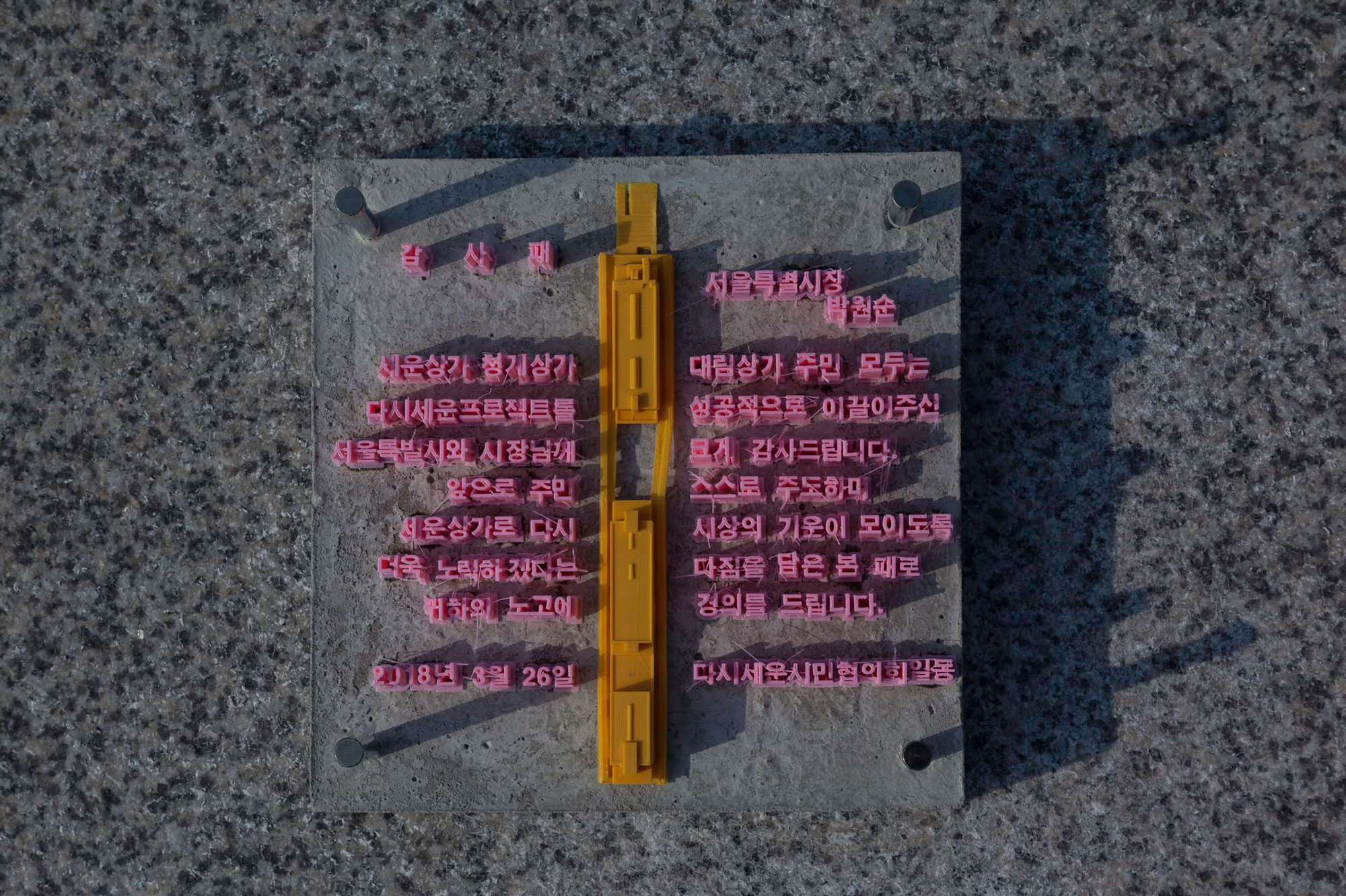 모두의 기대와 걱정이 뒤섞인 채, 이곳을 기반으로 하는 사람들의 모임이 생겼다. ‘다시세운시민협의회’라 이름 지은 이 모임에는 기존에 활동하고 있던 주민회 회장단, 상인연합회 사무국과 기술장인 대표를 비롯하여, 서울시에서 전략기관으로 초대한 씨즈, 사회적경제지원센터, 서울시립대학교, 팹랩서울 등과 메이커스 큐브에 입주한 창업자, 을지로 지역에서 활동하는 예술가, 다시세운 프로젝트를 실행하는 활동가와 서울시 주무 부처 담당자가 모두 모여 있다. 이 모임은 쓰레기 수거규칙, 크리스마스트리 설치, 주차권 발행 등 기존 결정 체계에서는 느릿느릿 이루어지던 실질적인 안건을 매우 빠르게 처리해냈다. 그러던 차에 주민회 회장의 제청으로 일련의 변화를 주도적으로 이끈다는 의미로 서울시에 감사패를 만들어 증정하자는 이야기가 나오기도 했다. 이후 실행 과정에서 감사패를 협의회 일원들이 직접 만들자는 크고 작은 아이디어들이 나왔고, 마침내 예술가와 활동가, 건축학과 학생들이 참여하여 세운상가 일대를 형상화하여 3D 프린팅한 감사패를 직접 만들어 시장에게 전달했다. 감사패에 올린 세운상가 모형은 현재 벌어지고 있는 변화에 대한 저마다의 우려와 기대를 모아 다시세운시민협의회라는 이름 아래 잘해보자는 다짐의 징표처럼 의연했다.