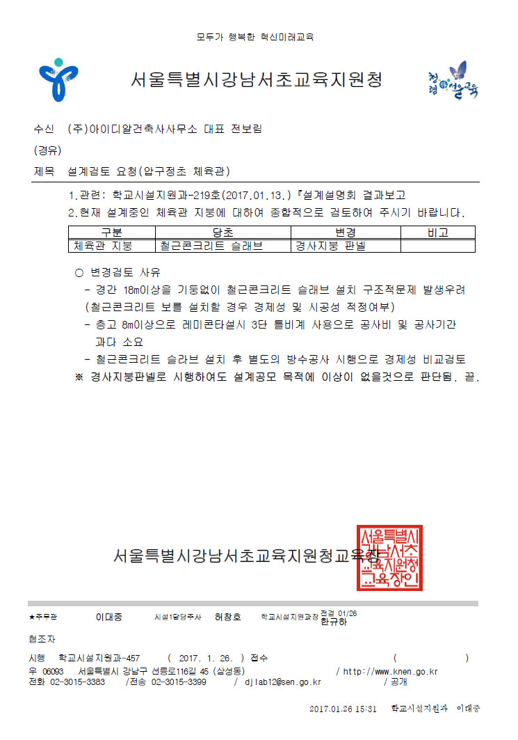 교육청 프로젝트가 힘든 이유 중 하나는 결제를 학교와 교육청 두 군데에서 받아야 하기 때문이다. 시어머니가 둘인 셈이다. 그런데 그런 면을 활용해서 조금이라도 말이 통하는 쪽을 우리 편으로 만들 필요가 있다. 우리는 항상 학교를 지원군으로 삼았다. ‘열심히 하겠다’, ‘믿어달라’며 건축 전문가로서 우리를 신뢰해달라는 뜻을 적극적으로 어필했다. 다행히 학교장들은 우리가 사심 없이 열정을 갖고 프로젝트에 임한다는 걸 믿어줬다. 건물의 완성도는 건축가가 얼마나 상세하게 내용을 정하고 그대로 구현하느냐에 달려 있는데, 그 결정과 승인 과정에서 학교장 사인이 있는 문서는 보증수표와 다름없다.