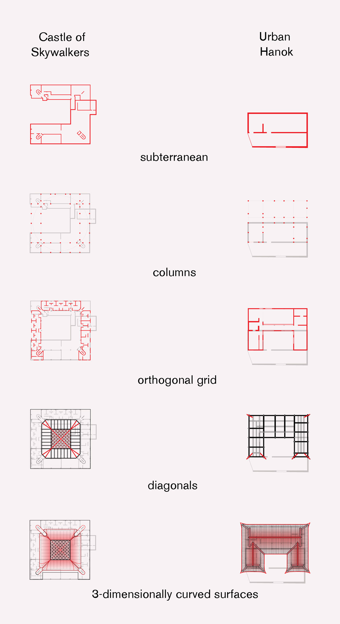 캐슬 오브 스카이워커스는 황두진이 그의 스승인 김종성의 올림픽 역도경기장에서 얻은 명쾌한 구조적 표현과 복합적 단일 공간에 대한 영감을 바탕으로 만들어낸 결과물이기도 하다.