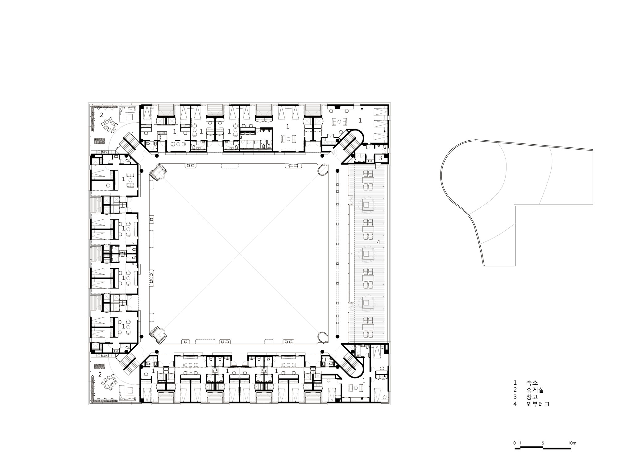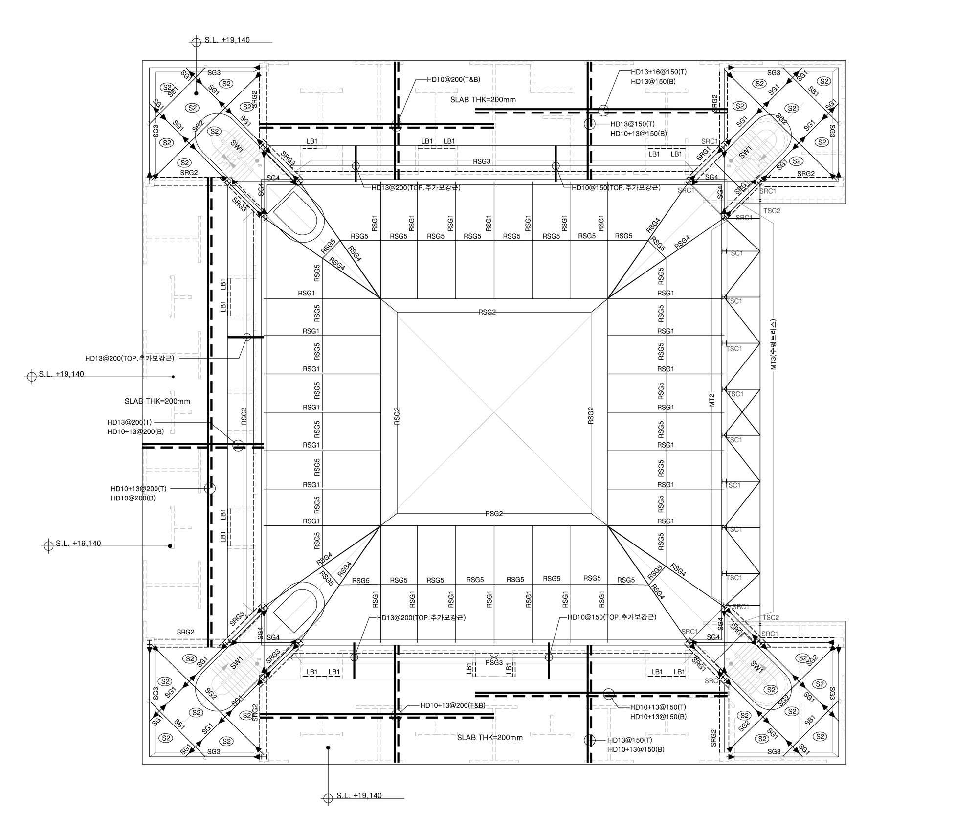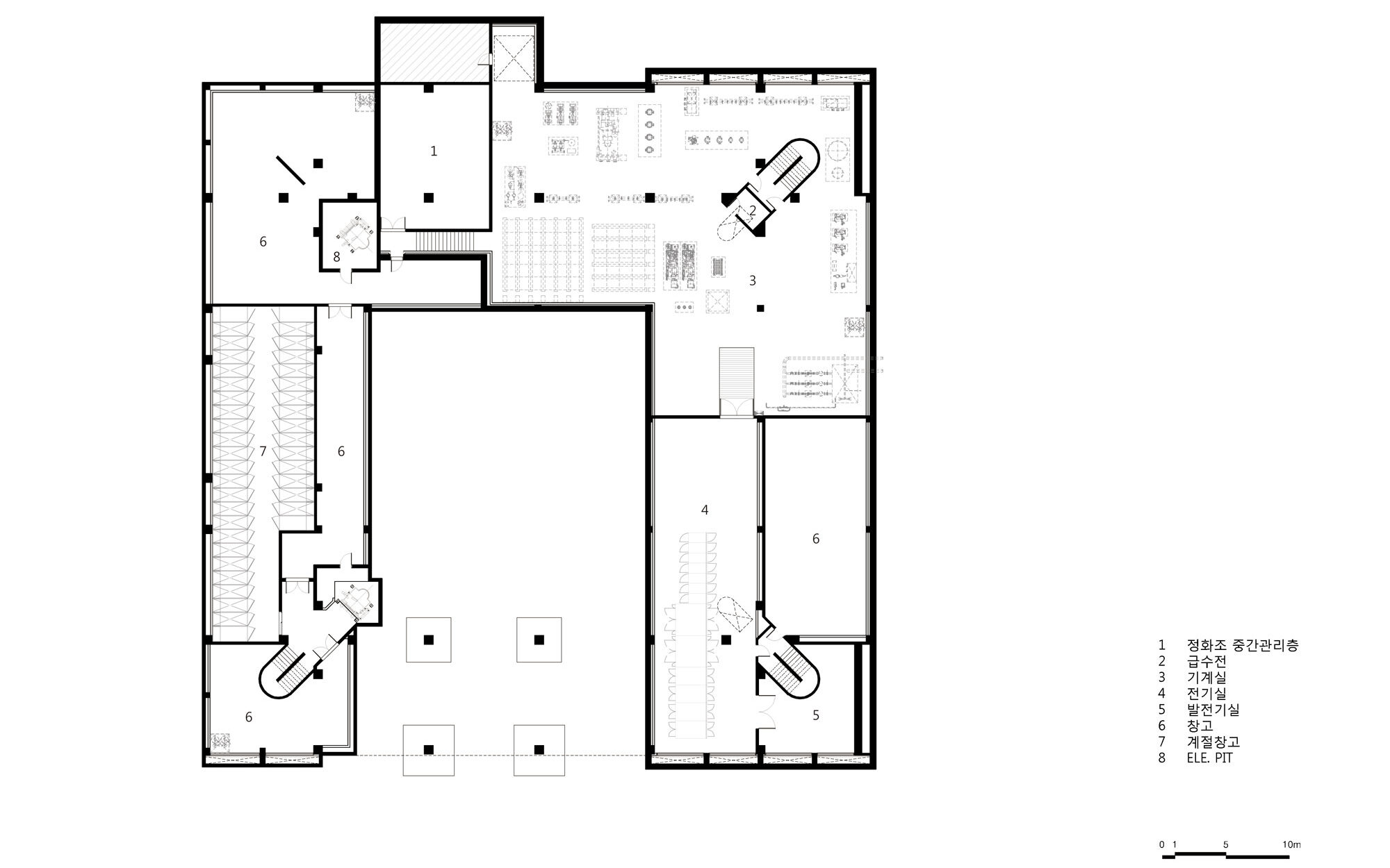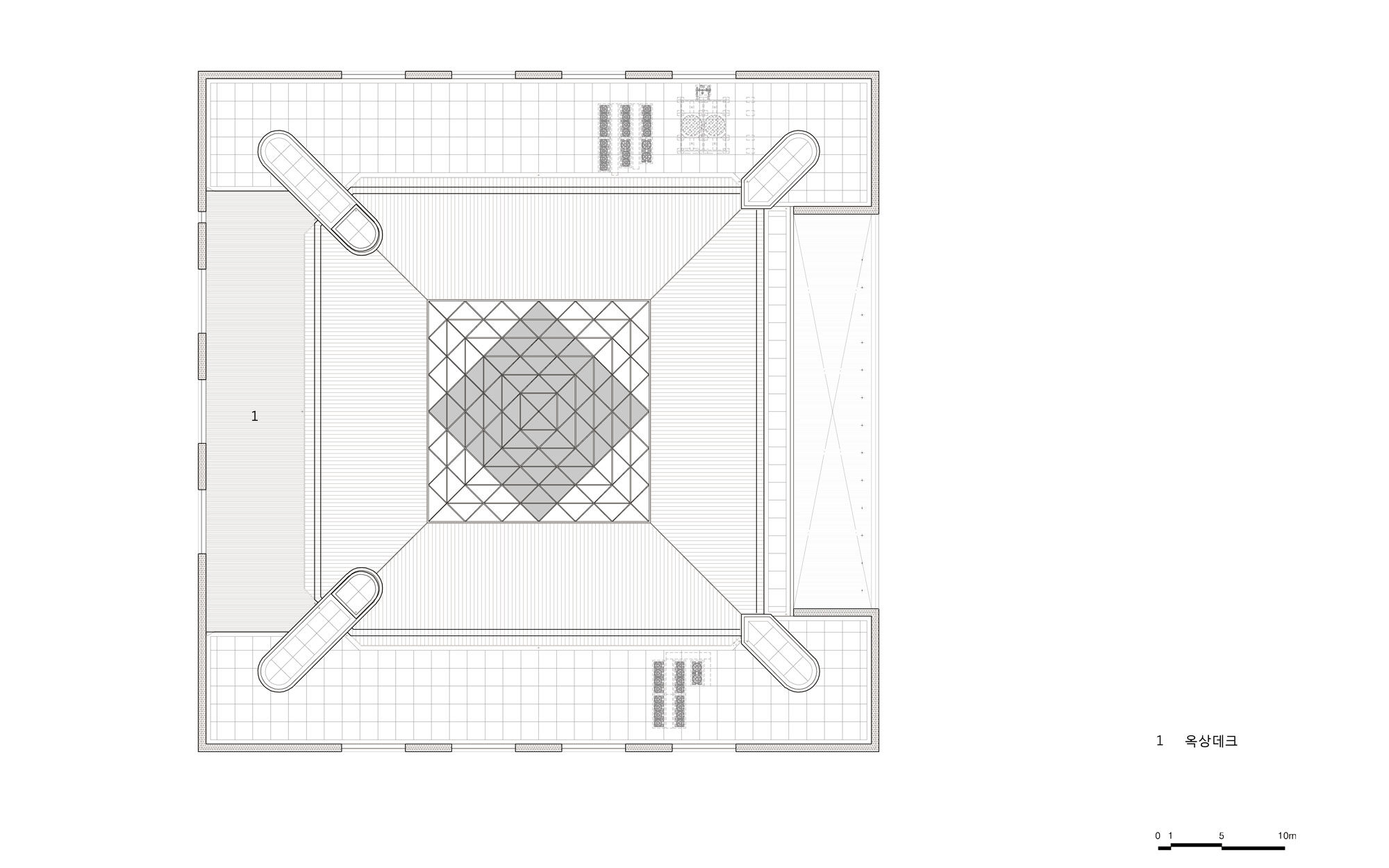 구조 엔지니어 황경주와의 협업을 통해 한 변의 길이 36미터, 대각선 방향으로는 47미터에 달하는 거대한 지붕을 트러스 없이 해결하는 싱글 레이어 구조의 지붕을 만들었다.