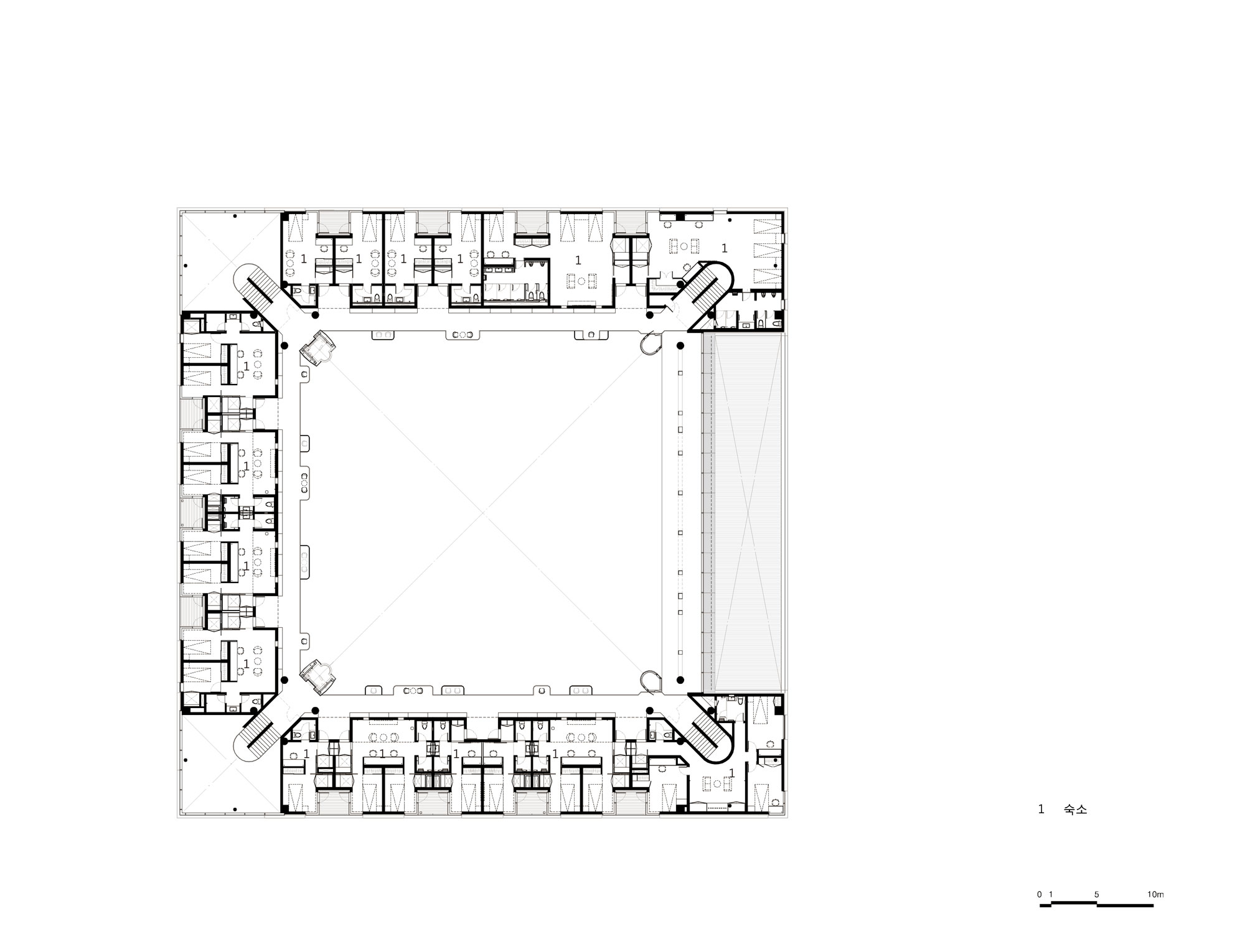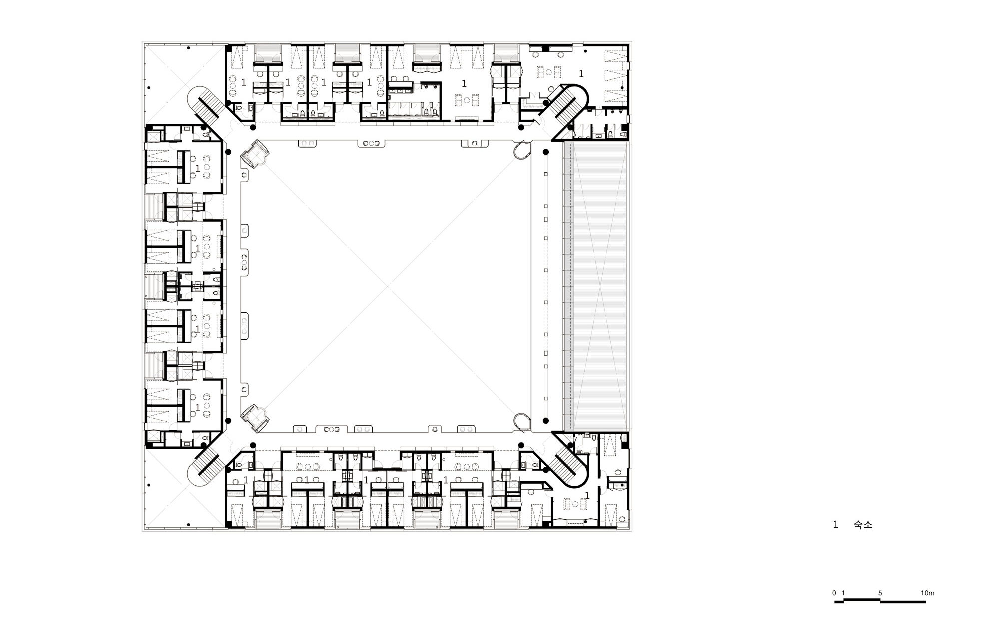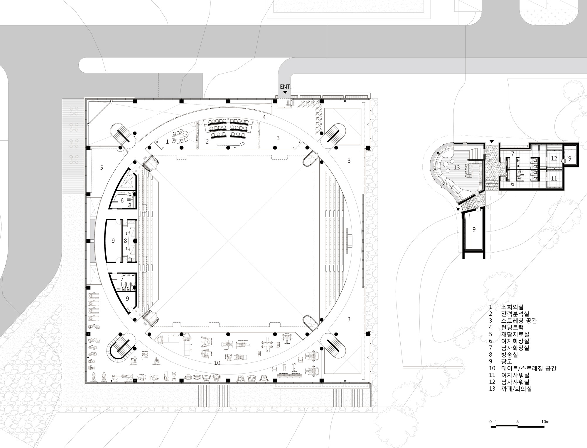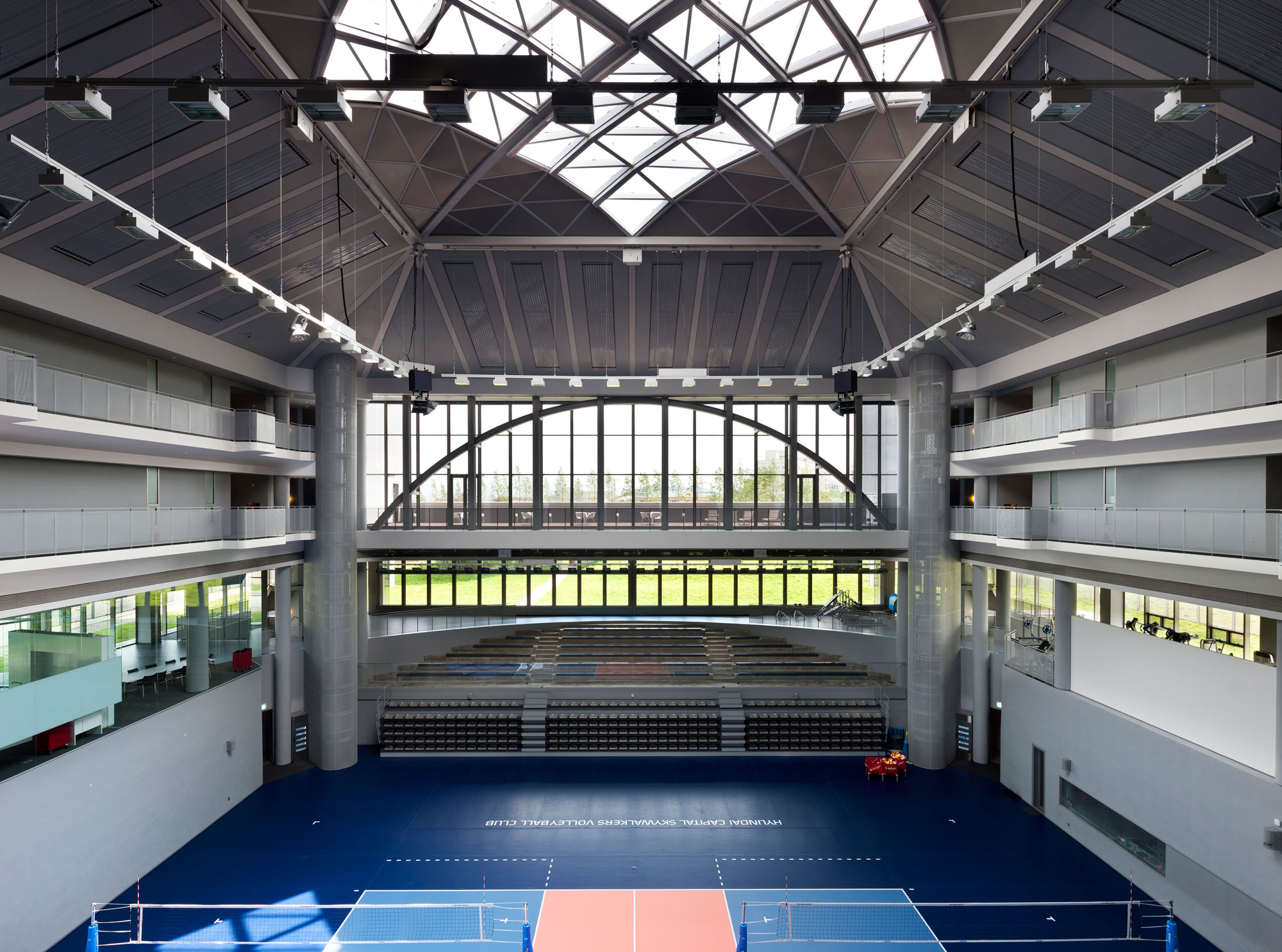건물 내의 모든 공간은 기본적으로 사각형, 원, 대각선이 조우하는 ‘중첩된 기하학’ 속에서 만들어졌다. 이 질서의 중심에 배구 코트가 있고 그 상부를 곡면 지붕이 덮고 있다. 구조 엔지니어 황경주와의 협업을 통해 한 변의 길이 36미터, 대각선 방향으로는 47미터에 달하는 거대한 지붕을 트러스 없이 해결하는 싱글 레이어 구조의 지붕을 만들었다.
