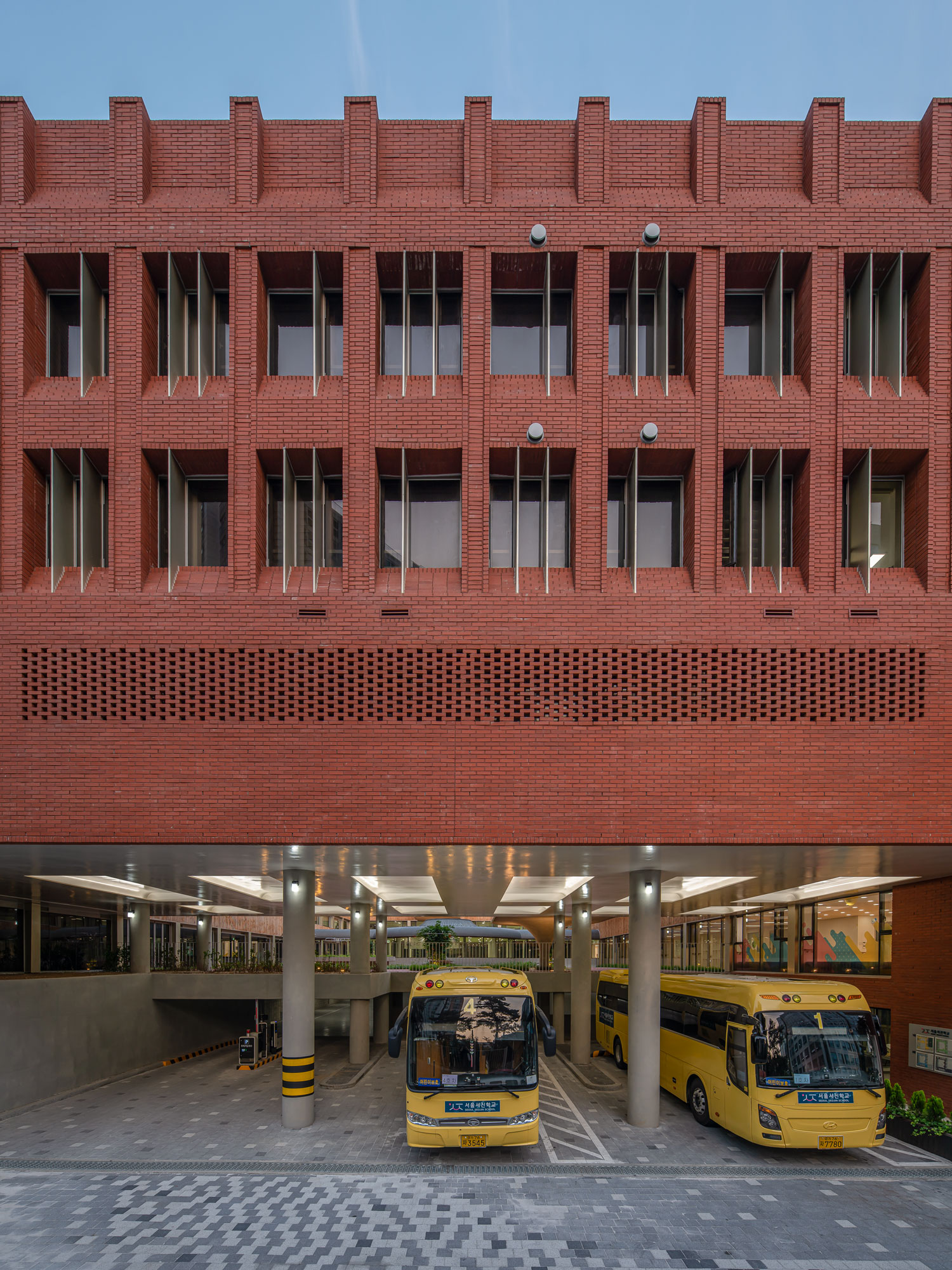 지하 로비는 등하교 시 출입 공간으로 사용되는데, 노란색 통학 버스와 자가 통학 차량이 한데 모인다. 등하교 시간에 흰 벤치에 학부모님들이 쭉 앉아 아이들을 기다리고 있는 광경이 장관이다. 출입문이 하나로 통일되어 있어 선생님, 학부모, 학생이 한자리에 만나 소통할 수 있고, 안전사고의 위험도 적다. 이곳에서 선생님이 학생의 손을 잡고 학부모님께 하루 일과를 전달하고 서로 인사를 나누는데, 이렇게 좋은 공간으로 활용될 줄 알았는지 모르겠다.