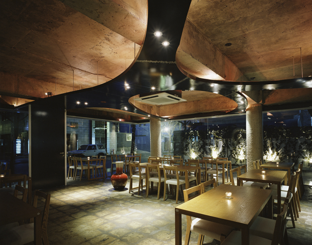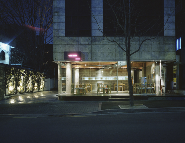 2004년 한국에서 사무소를 열고 3년을 일 없이 보냈다. 이러다 큰일 나겠다 싶어서 친구 둘에게 사업계획서를 만들어 보여줬다. 요리와 음식을 좋아해서 자주 다녔던, 그때만 해도 조용한 동네였던 가로수길 한켠에 같이 식당 사업을 하자는 내용이었다. 그렇게 첫 상업 공간 설계를 하게 됐다. 2006년 무렵이었다. 이때도 풀어진 평면, 개방적 공간에 대한 생각을 많이 했다. 건축 경계선을 약간 침범하는 처마 같은 요소를 사용하고, 바닥에는 처마에 호응하는 단을 만들고, 그 위에 경계를 감싸는 ㄱ자로 꺾인 유리 벽을 세웠다. 그 주위에 조명과 인조 담쟁이를 배치해서 공간이 하나인 것처럼 만들었다. 그리고 ‘연속적인 분절’이라는 건축적 주제를 실내 공간에 풀어보려고, 평면적으로는 균일한 테이블을 놓고, 천장에서는 다른 형태의 공간감을 냈다.