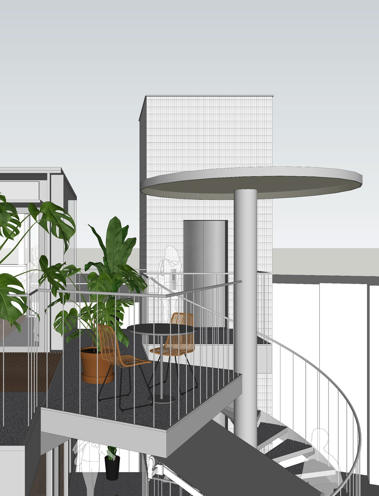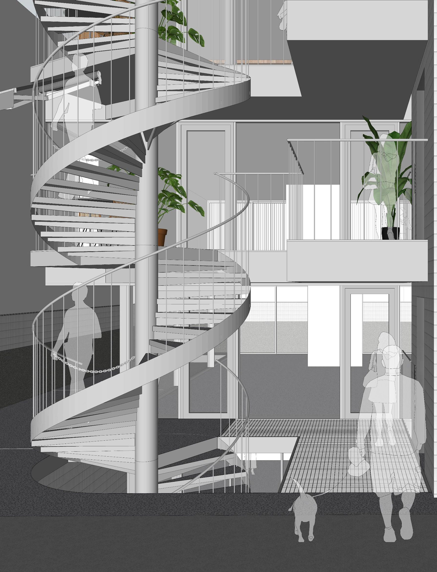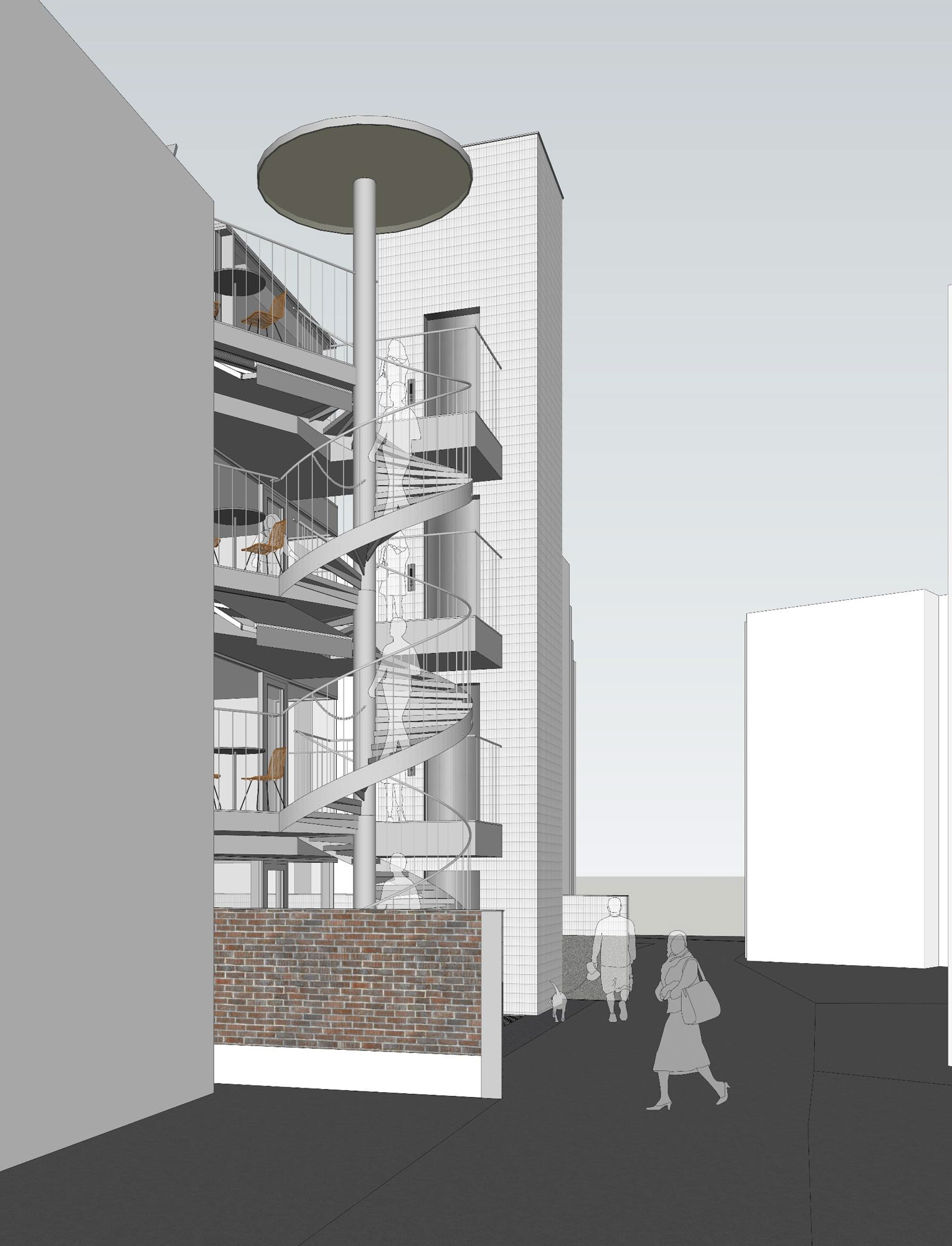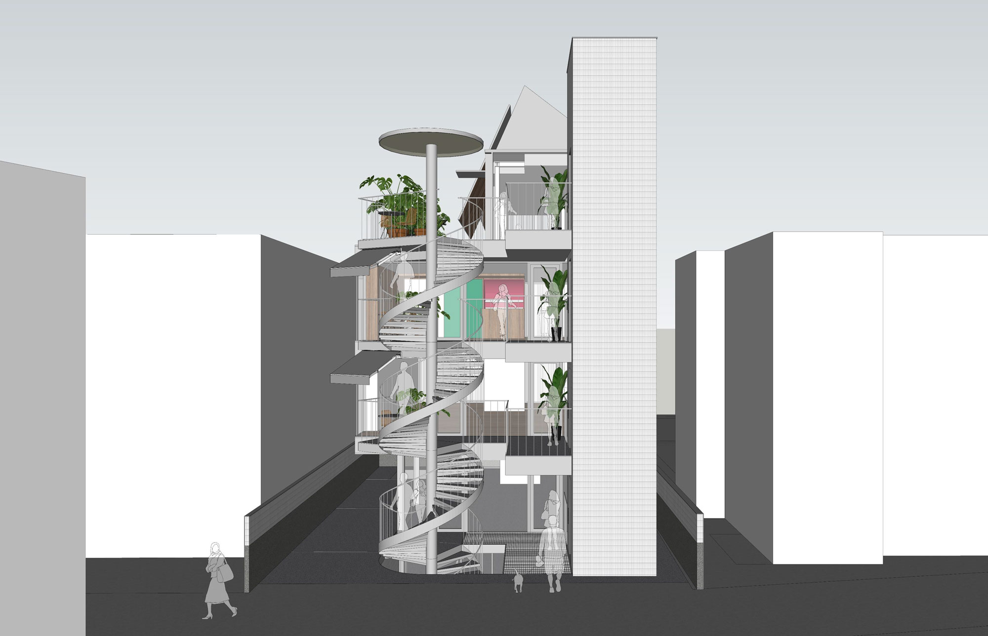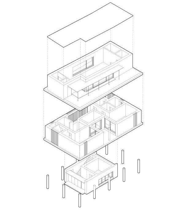 한국에서는 근린생활시설을 과하다 싶을 정도로 디자인하는데, 대부분 그 형태들이 내부공간 구성과 관계를 맺지 않는 경우가 많다. 용적률, 프라이버시, 중간영역에 대한 관습적인 건축 계획으로는 진정한 ‘근린생활’을 지원해주지 못한다. 그 문제를 이렇게 건축 요소들을 분할 배치하는 방식으로 해결해보려고 한다. 조용한 골목에 이 건물이 들어서면 거리의 풍경도 즐거워보일 것 같다. 무뚝뚝하지 않고, 현란하지도 않고, 자신을 뽐내지도 않는 건축이 되지 않을까 기대한다.