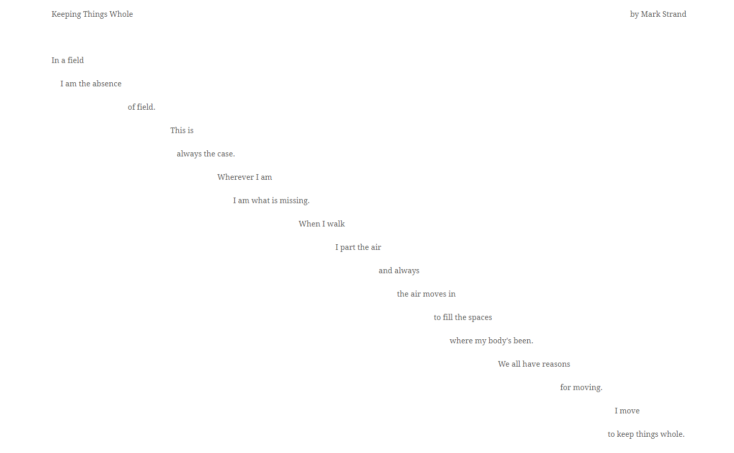 서승모 좋아하는 시를 하나 가져왔다. ‘Keeping Things Whole’라는 제목의 시다. 대략의 의미는, ‘내가 있던 장소는 어떤 곳의 부재이고, 내가 그곳에 있으면 공기와 바람이 들어가지 못하고, 그들이 온전히 들어올 수 있도록 내가 움직이고, 그렇게 전체를 보존하는 것이 내 목적’이라는 내용이다. ‘전체’라는 말은 일본어에서 물사로 표현된다. 이는 세상을 사물과 사건으로 바라보는 관점이다. 이와 비슷한 생각으로 건축을 하려고 한다.
