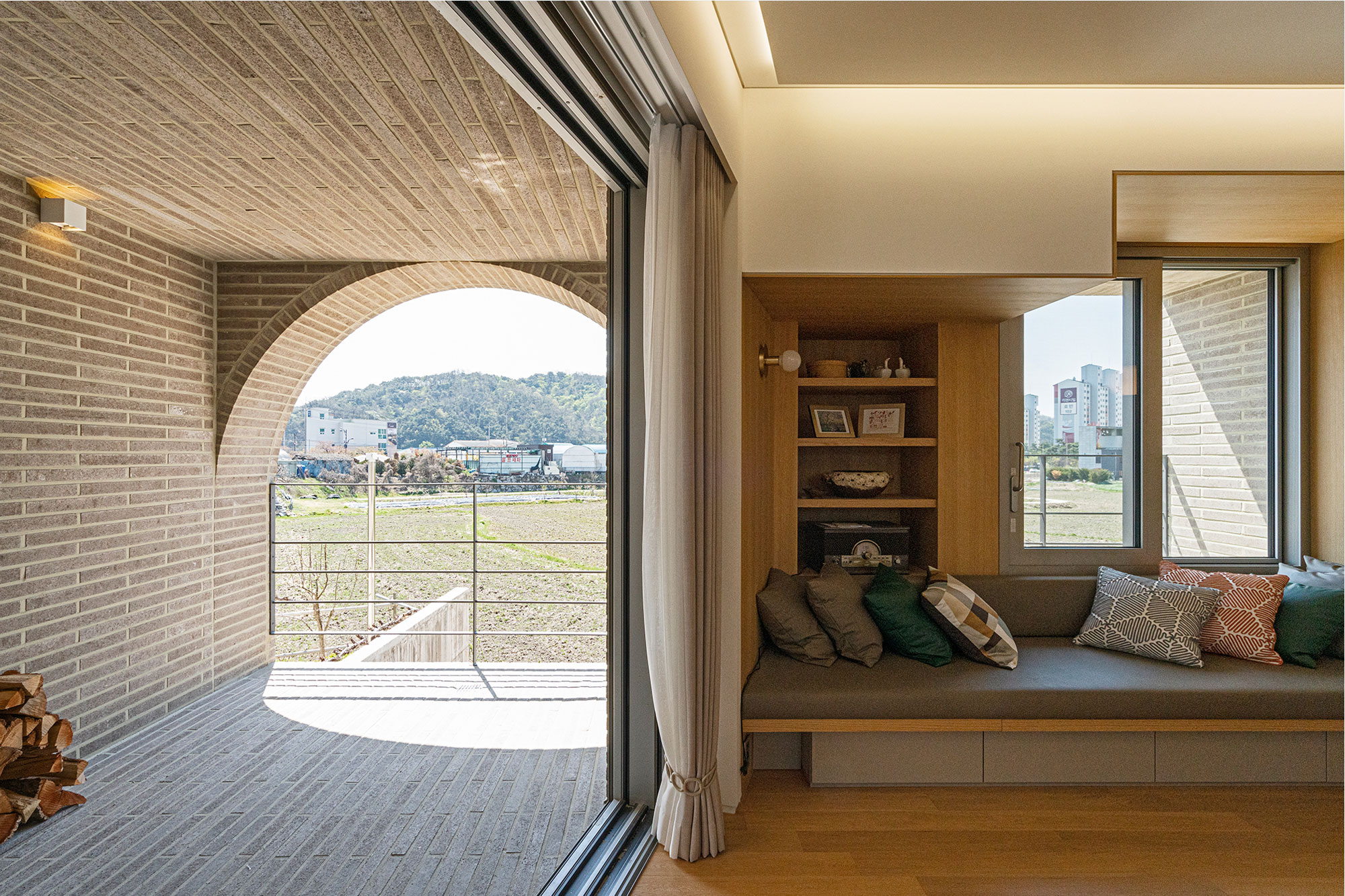네덜란드에서 공부하면서 크고 작은 도시와 건물 구경을 많이 다녔는데, 오래된 수도원같이 고전적인 구축법으로 지어진 공간에 가면 느낄 수 있는 강렬한 힘에 완전히 매료되어 언젠가 그런 공간을 만들고 싶었다. 그때 바랐던 몇 가지 중, 이 집의 거실에서 벽의 두께 안으로 들어가서 머물 수 있는 공간을 구현했다. ‘요즘 시대에 가족을 위한 공간은 어떤 형태일까’라는 질문에 규모나 성질이 다른 공간이 응축되어서 공존하는 것이 하나의 대안일 것으로 생각했고, 어느 정도 실현된 것 같다. 준공 사진을 촬영하러 갔을 때 가족들이 우리가 상상한 대로 그 공간에서 따로 또 같이 공존하는 모습을 보니, 건축가로서 믿고 바랐던 바를 확인 받은 기분이었다.