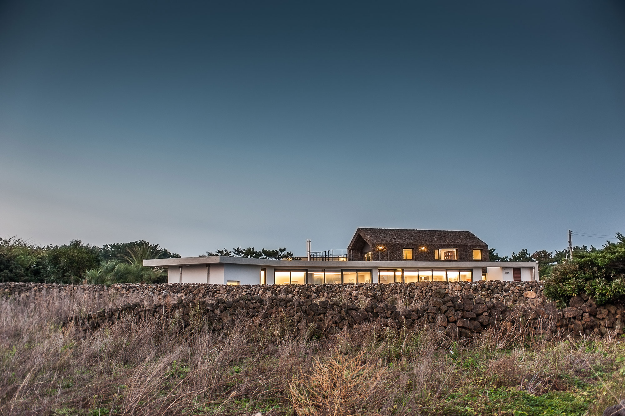 하도리 돌집은 여행사를 운영했던 분이 은퇴하면서 제주도에 땅을 구하며 시작된, 제주도라는 지역이 시작이고 끝인 프로젝트였다. 그래서 ‘제주’하면 흔히 떠올리는 바다, 바람, 돌, 그리고 거친 환경에 남아있는 기억, 아우라와 같은 것이 이 프로젝트에서 놓치면 안되는 콘텍스트라고 이해했고, 그 맥락에서 이 프로젝트가 어떻게 존재할 수 있을지로부터 출발했다. 처음에는 훨씬 인공적인 재료들, 금속이나 목재 마감을 생각했었는데, 현지 환경과 기후로 인해 건축 재료가 너무나 금방 상해버리는 것을 보았다. 그래서 이 땅에 순응하고 공존하기 위해서는 여기에서 살아남은 재료를 써야겠다는 판단을 했다. 그렇게 해서 집이 망가지지 않고 주변과 어우러지며 서서히 나이 들어갔으면 하는 바람이 컸다. 그 과정에서 현무암을 마감재로 정했는데, 시공법도 제주 현지 작업자들이 알려주었다. 현무암으로 외벽을 감싸는 시도가 그때만 해도 흔한 일이 아니었고 가능한지조차 몰랐다. 그런데 현지 작업자가 자연스럽게 돌을 끼워서 마감하는 방식을 제안해주어서 해결됐다. 현지의 노하우를 채택한 또다른 아이디어는, 감귤 창고문에 쓰인 슬라이딩 도어 하드웨어였다. 건축주가 이 집의 거실에 최대 크기의 창을 원했는데 프라이버시 문제가 있었다. 그래서 목공 작업자와 현지의 창고문 하드웨어를 활용해 루버 구조체를 만들었다.