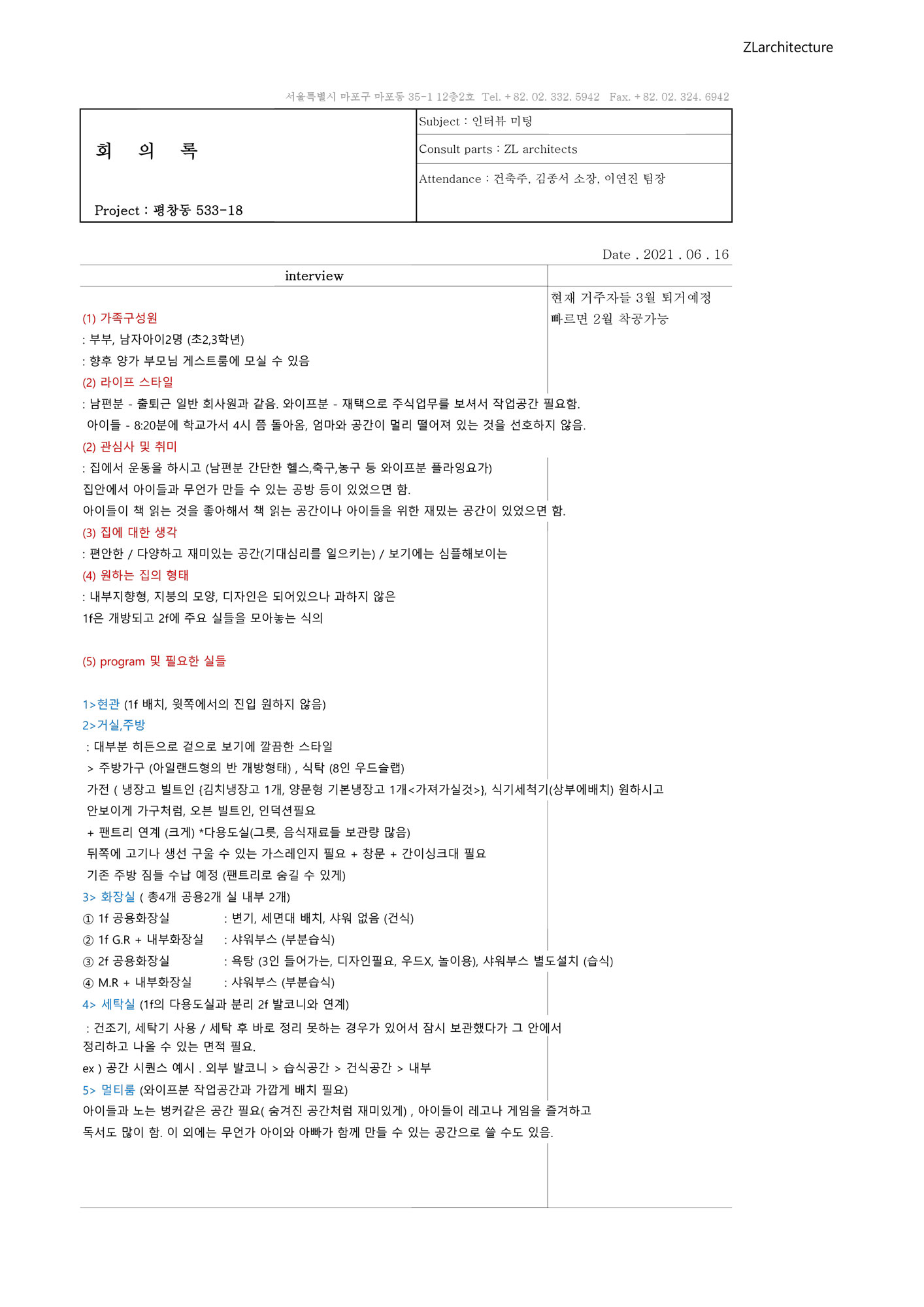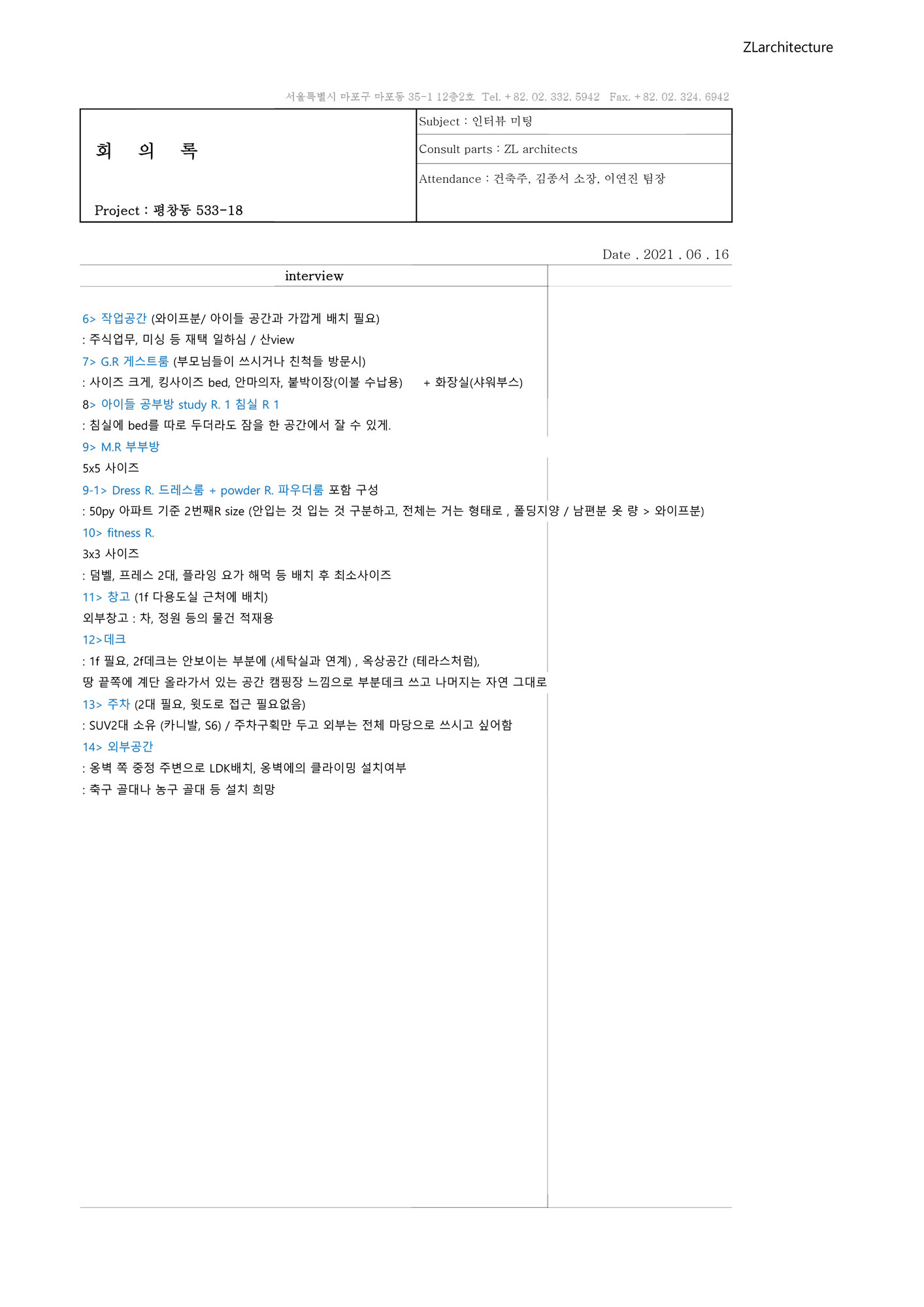 김종서 주택 설계에 있어서는 나름의 방법론이 생겼다. 주택은 사람에 따라 어떤 집을 짓고 싶은지가 천차만별이다. 명확한 목표, 평면, 이미지를 가져오는 사람도 있고, 모든 게 희미한 사람도 있다. 그래서 우리는 전략적으로 첫 인터뷰를 굉장히 오래, 자세히 한다. 어떤 취미가 있는지, 가족 구성은 어떤지, 어떤 사람들을 초대하는지, 어떤 물건이 많은지, 가구는 무엇을 가지고 있는지 등등을 정리해둔 인터뷰지를 따라 대화를 나눈다. 그 답변들로부터 방향을 찾는다.