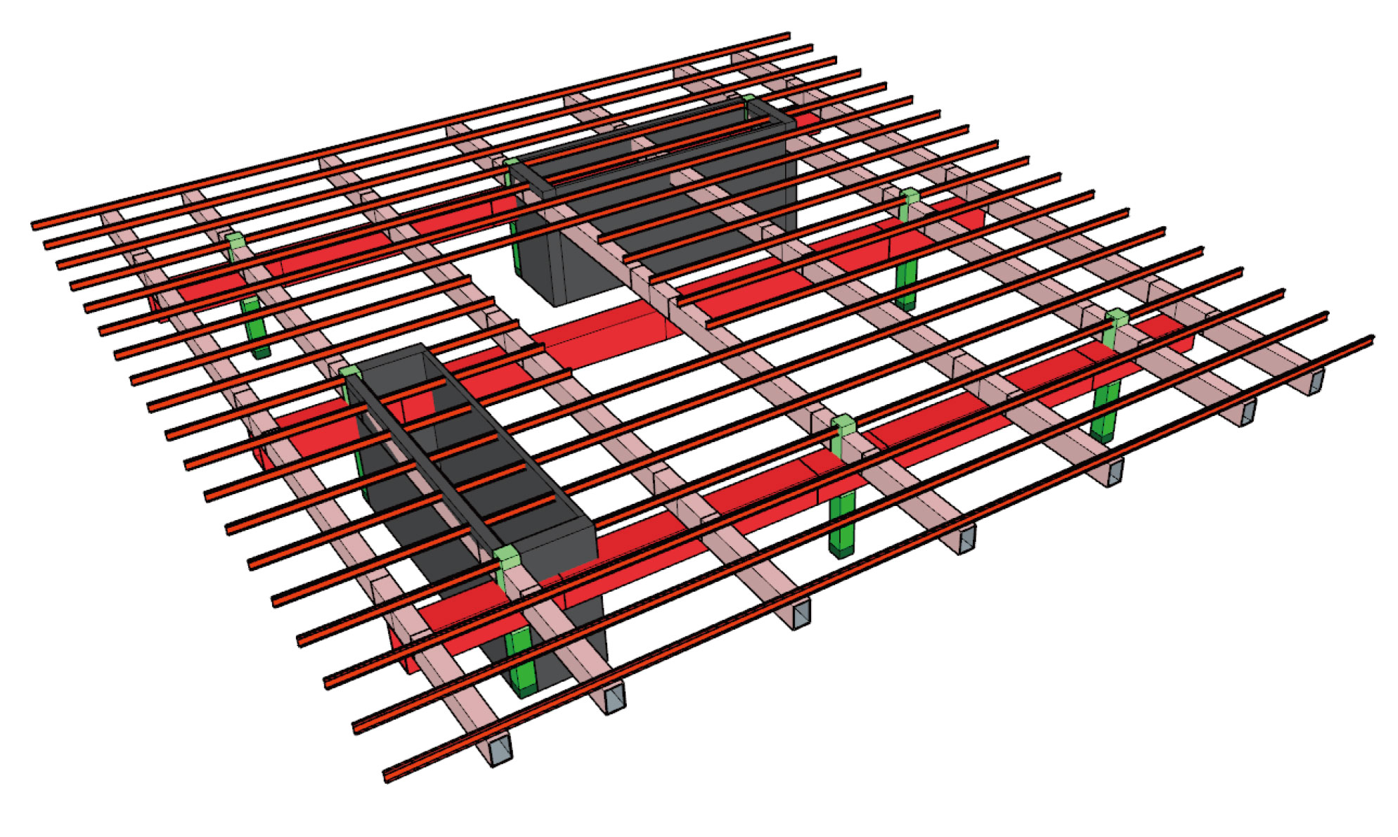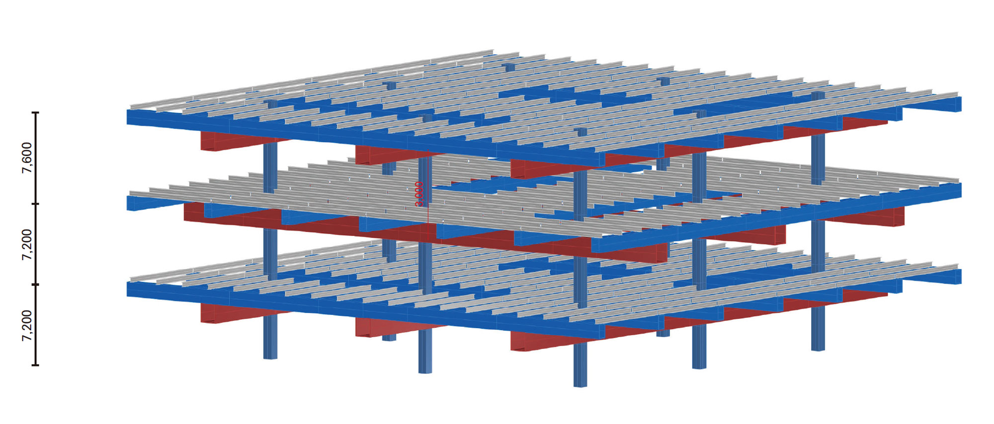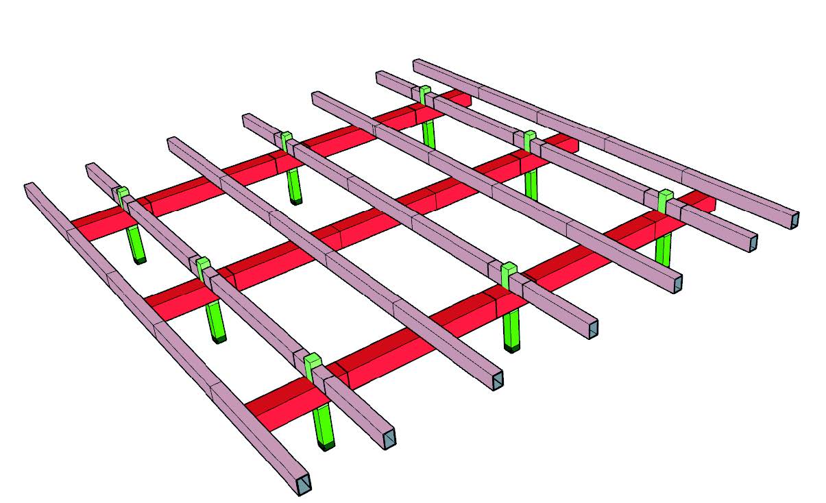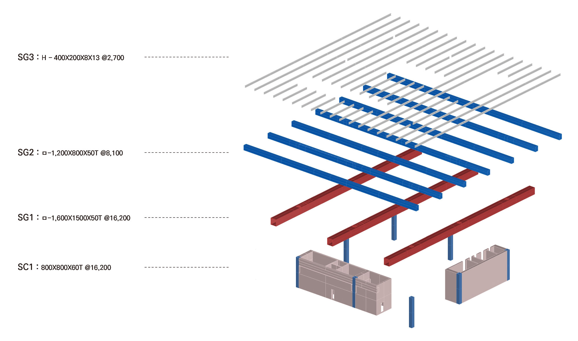 김유경 재사용 부재로 건물을 짓는 것은 다음 과제로 남겨두고, 교량을 확보했다는 가정하에 교량 부재 대신 신재로 건물을 구현해 보는 단계로 넘어갔다. 공모안의 적층 개념에 신재를 적용했을 때 구조 계산을 하여 나온 부재 시스템은 다음과 같다. 800×800×60mm(SC1) 기둥을 16.2m의 간격으로 배치하고, 위에 1,600×1,500×50mm(SG1)의 대형 철골빔을 보로 얹으며 마찬가지로 16.2m의 간격으로 배치한다. 그 위로 1,200×800×50mm(SG2)를 8.1m의 간격으로 배치하고, 마지막으로 H빔인 400×200×8×13mm(SG3)를 2.7m 간격으로 적층한다.