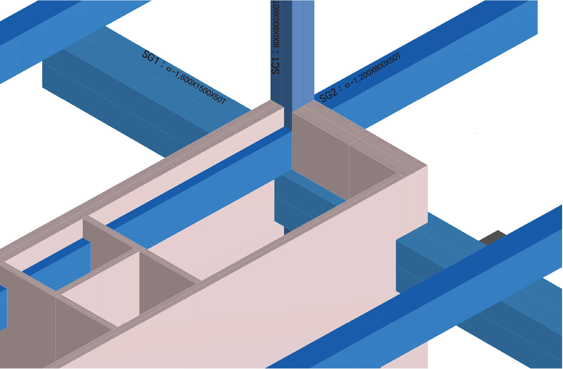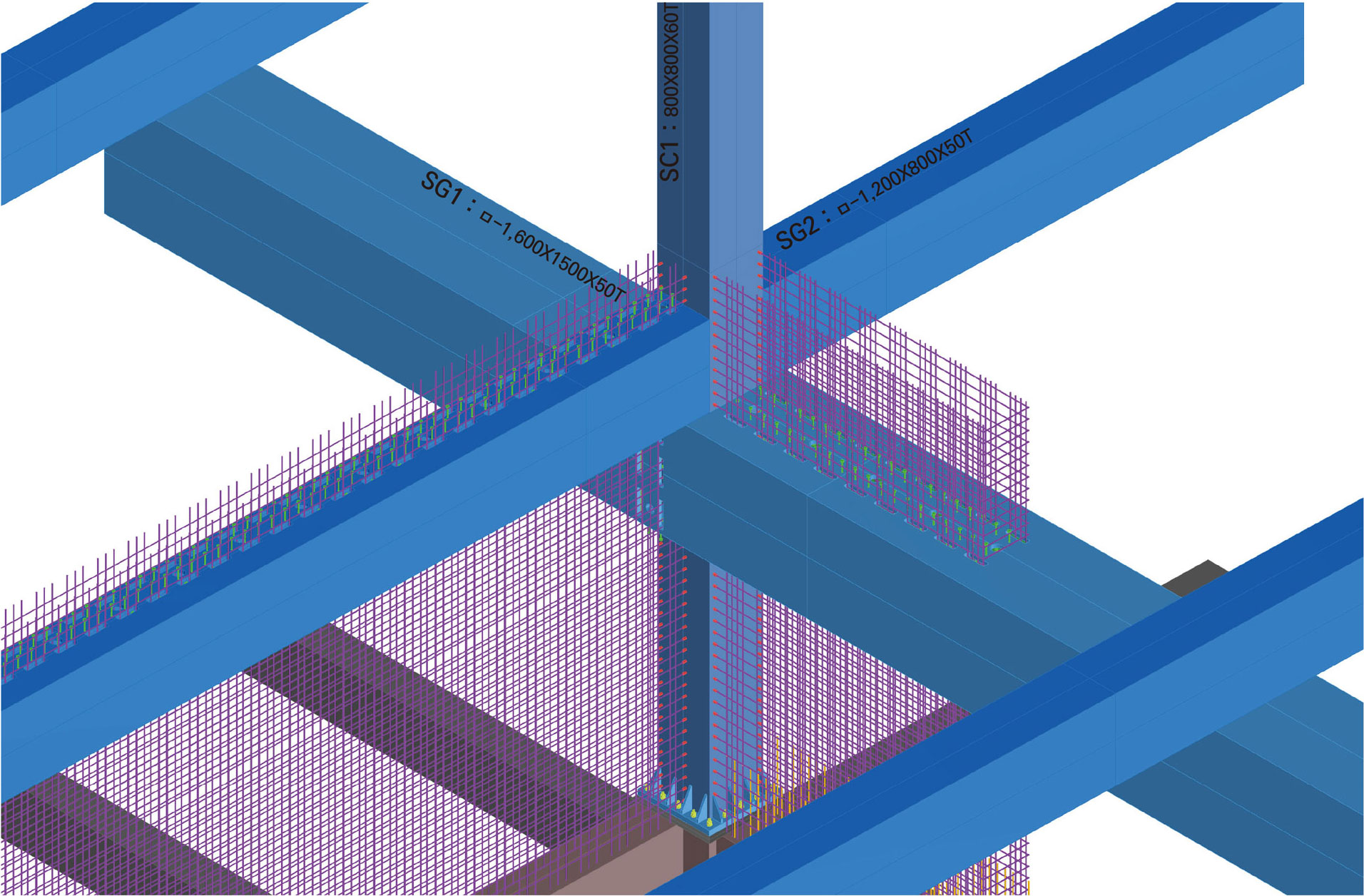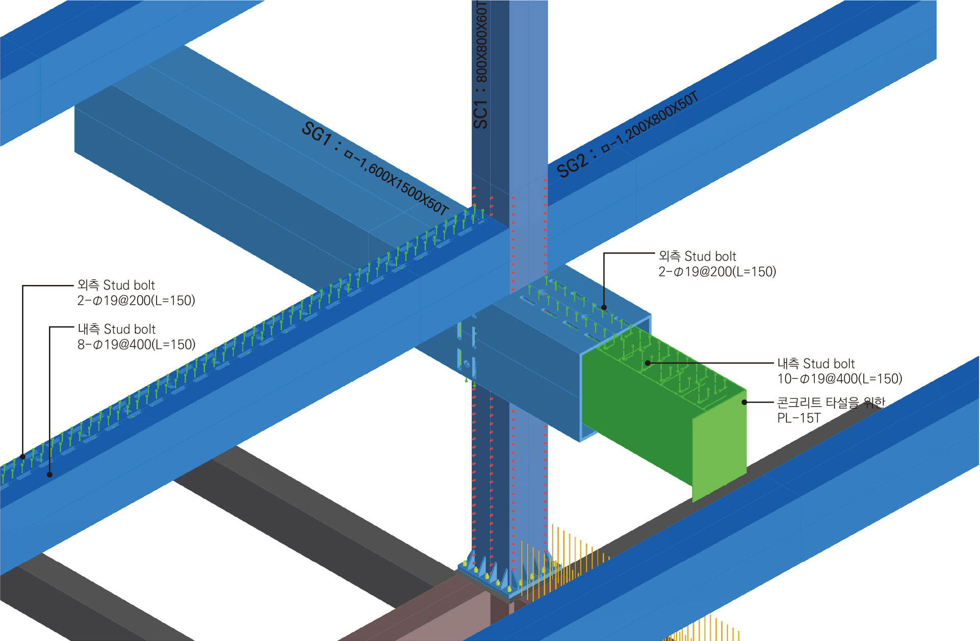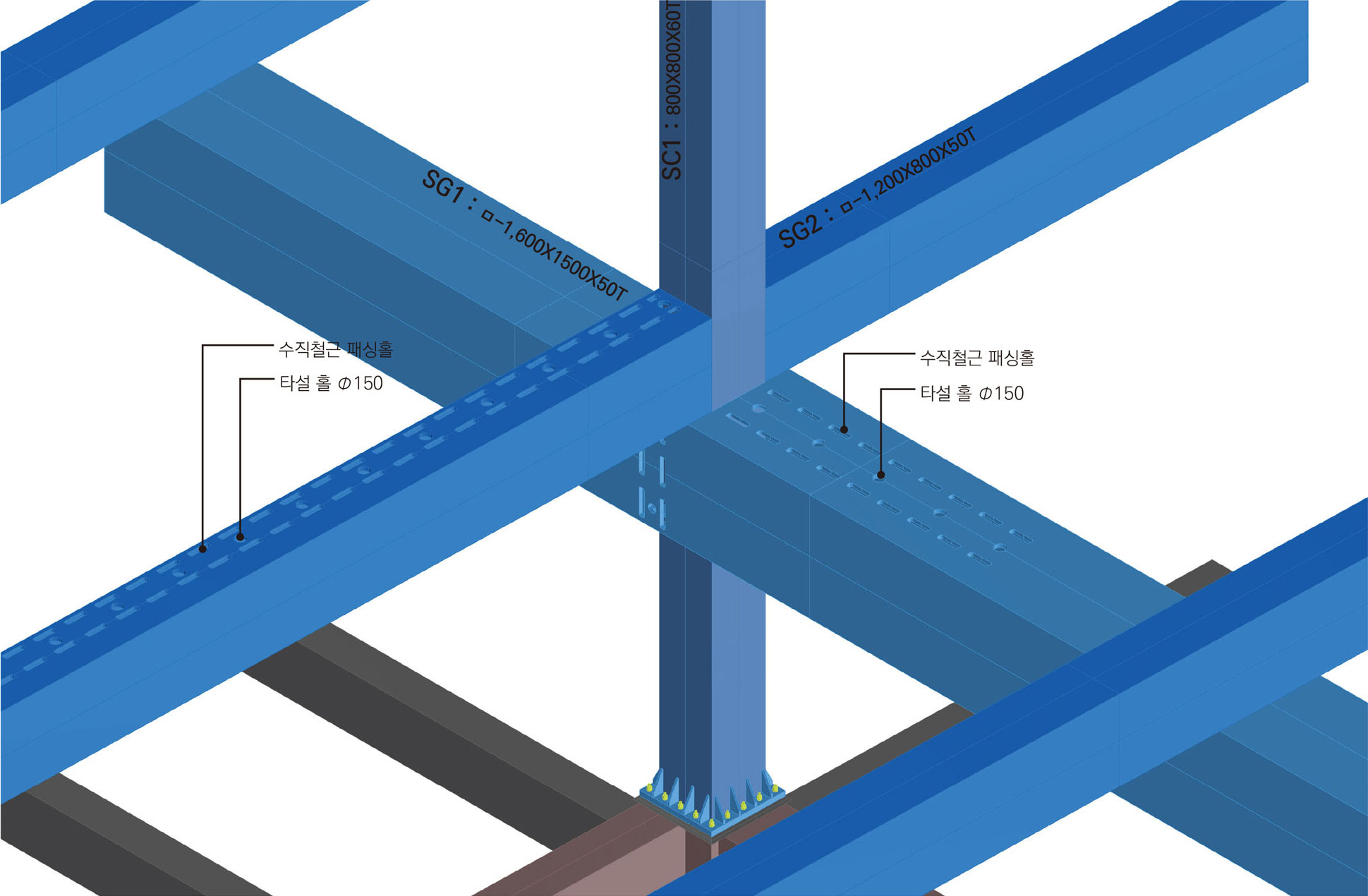 시공은 기둥부와 캔틸레버 접합 부분을 먼저 설치하고, 가장 큰 하단의 보(SG1)를 설치한 후, 두 번째 보 레이어(SG2)를 적층하는 순서를 따른다. 이때 횡력을 잡아주는 코어 벽체의 구조적 이슈를 해결해야 했다. 코어 벽체가 횡력을 95% 이상 잡을 수 있도록 수직적으로 연속해야 했는데, 벽체가 보로 인해 끊기지 않고 보를 관통하는 방법을 건축사와 구조기술사가 머리를 맞대어 구현했다. 철골빔에 벽체의 철근을 배근하고, 타설할 수 있도록 철근 패싱홀(passing hall)과 지름 150mm 크기의 타설홀을 만들었다. 기존 구조 형식이 아니라 새로운 아이디어를 제시하고 발전한 것이다. 콘크리트 타설 시 철골빔 사이로 콘크리트가 빠져나가지 않도록 빔의 중간중간에 거푸집 역할과 구조 보강을 동시에 할 수 있는 플레이트들을 설치했다. 이런 방식으로 전 층에 걸쳐서 코어 벽체의 연속성을 유지할 수 있게 된다.