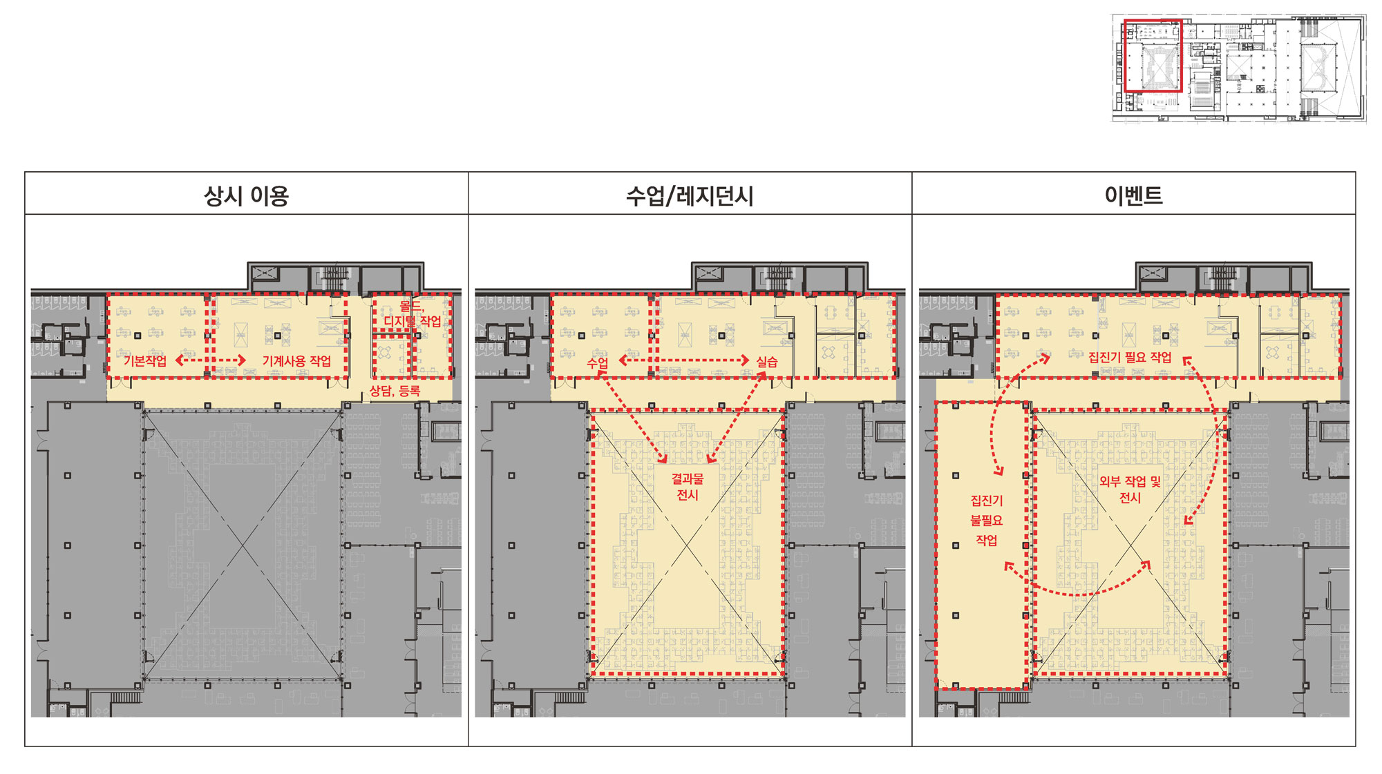 국립도시건축박물관의 프로그램은 다음과 같이 구성된다. 지하 2층에는 기계⋅전기실, 지하 주차장이 위치하고, 지하 1층의 남측 선큰 쪽에서는 워크숍, 교육, 다목적 프로그램을 수용하며, 북측 선큰을 중심으로 지하 1~2층 두 개 층에 걸쳐 상설 전시실이 마련되었다. 선큰 상단에 위치하는 팹랩은 다양한 이벤트를 수용하는 가변 공간이다. 지역 주민에게 상시로 열린 공간으로, 예를 들어 국립아시아문화전당의 ACT 페스티벌, 피어 나인 리소스(Pier 9 Resource)과 유사한 형태로 사용될 수 있다. 또한 특정 주제를 가진 레지던시나 한 달에서 석 달 커리큘럼의 수업 운영에도 이용할 수 있다. 나아가 팹랩과 창작 스튜디오, 선큰을 하나로 연결하여 큰 이벤트를 열 수 있는 가능성도 충분하다. 디자이너, 엔지니어, 건축가를 주축으로 매년 열리는 건축 설계 워크숍 및 컨퍼런스 ‘스마트지오메트리(Smartgeometry)’와 같은 국제 규모의 이벤트도 개최될 수 있다. 이런 다양한 활동을 통해 만든 결과물을 다시 발코니와 선큰 등에 전시할 수 있다. 이러한 예처럼 자체적으로 다양한 규모의 전시, 교육, 연구 활동이 이루어지고, 그렇게 생산된 콘텐츠가 다시 전시되고 기록되면서 지속적으로 진화하고 성장하는 박물관이 되기를 기대한다.
