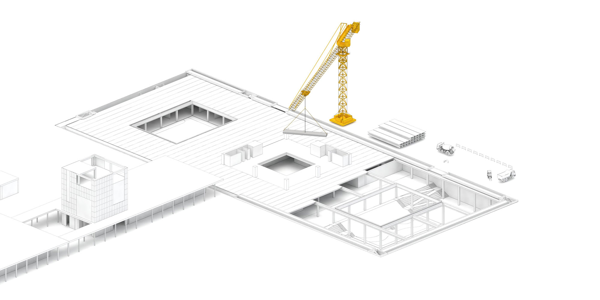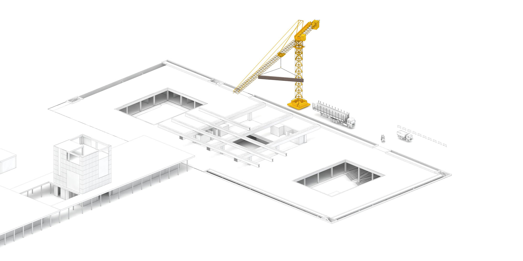 부재의 연결도 기존 방식과는 달라야 했다. 부재의 끝인 연결 부분을 모두 용접하려 했지만, 현장 시공의 품질 확보가 어렵기에 볼팅 접합을 검토하라는 의견이 있었다. 빔의 크기가 크고 연결 부재가 많아 기존 건축 분야에서는 자료를 찾기 어려워 교량 시공 방식을 참고했다. 플레이트 하나당 100~200kg 무게로 사람이 들고 조립하기 어렵기 때문에 가볼팅으로 미리 조립한 상태에서 1500~1600mm 사이 공간에 사람이 들어가 나머지를 조립하는 방식을 선택했다. 철골빔의 양중은 부지 내에 설치한 대형 크롤러 크레인4이 담당한다.