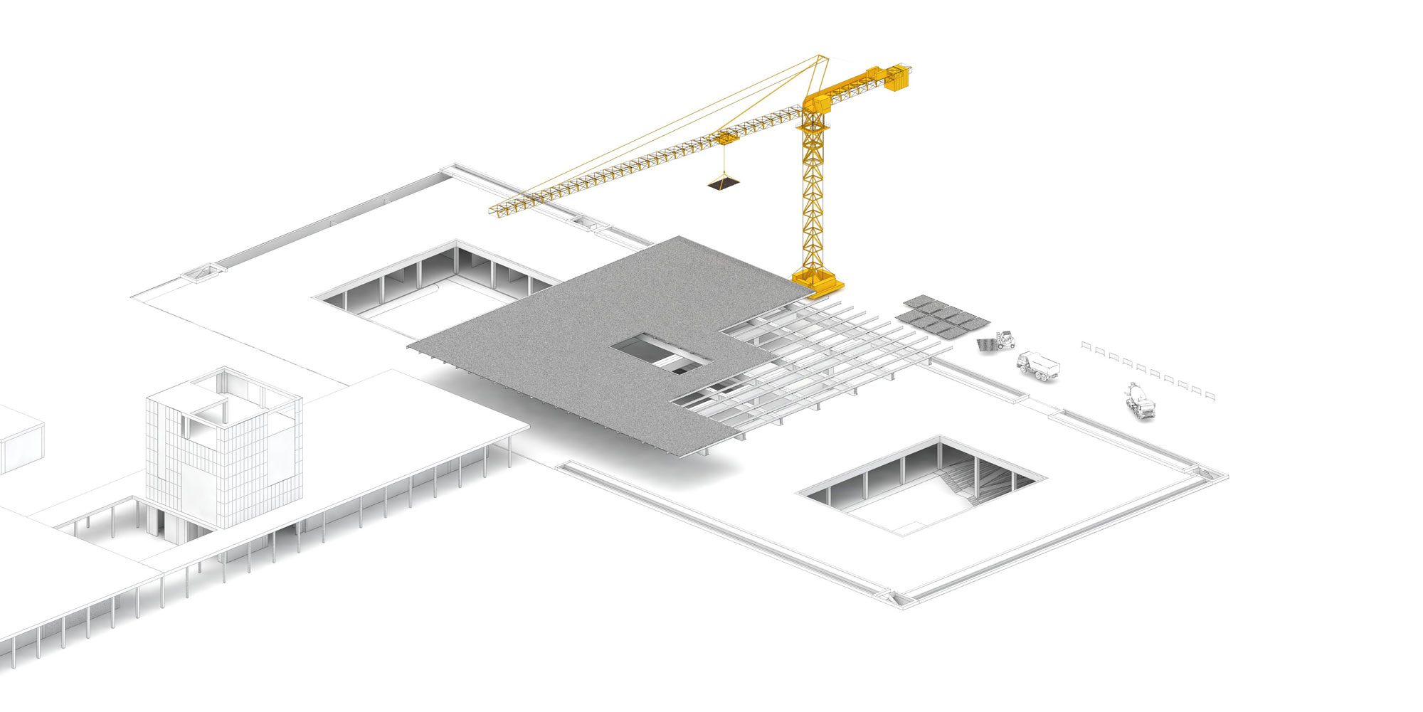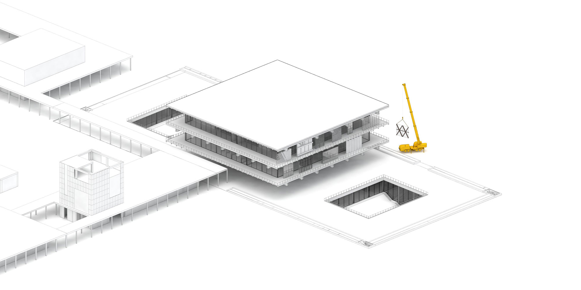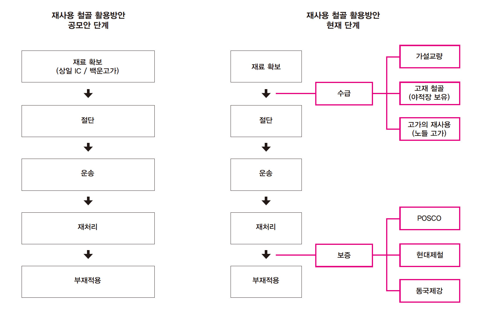 더 핵심 사항은 어떻게 가져오고 어디에 보관했다가 어떻게 사용할 것인지였다. 보통 철거, 시공, 절단 업체가 별개이기에 업체들을 순차적으로 선정하여 진행할지 정해야 했다. 우선 필요한 철골 수량을 철거 직전에 이른 교량의 물량으로 충당할 수 있는지 조사했다. 당시 철거 예정인 상일 IC 교량에서 20%의 물량을 확보할 수 있었다. 박물관 전체에 재사용 부재를 적용하기란 실질적으로 불가능했고 예를 들어 건물의 일부인 1층 부재를 재사용하는 것은 가능했다. 대안으로 한시적 목적으로 설치하는 가설 교량을 이용하는 방법도 고민했다. 제품이 규격화되어 있으며 다량의 취급 업체를 통해 자재를 조달하기 쉬웠으나, 가설물이다 보니 장기적으로 이용되는 교량에 비해 구조 부재로 사용하기가 적합하지 않았다. 또한 재사용 부재의 적용 범위를 계단, 전시, 인테리어 요소처럼 비구조부재의 일부로 전환하는 것도 하나의 옵션이었다.
