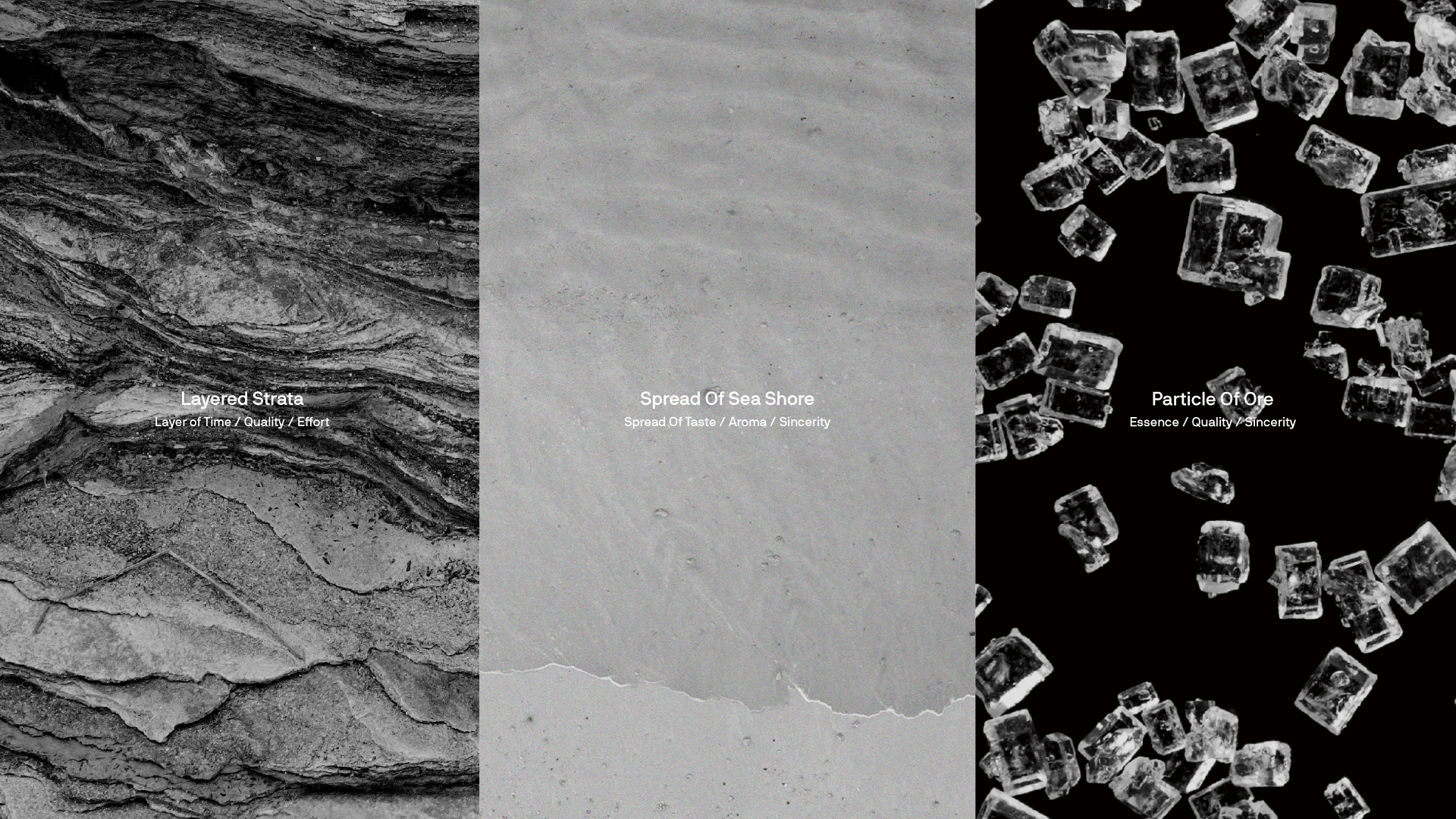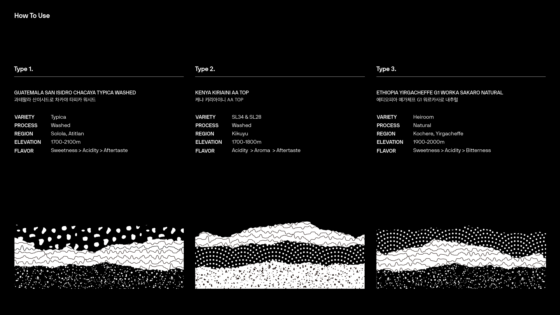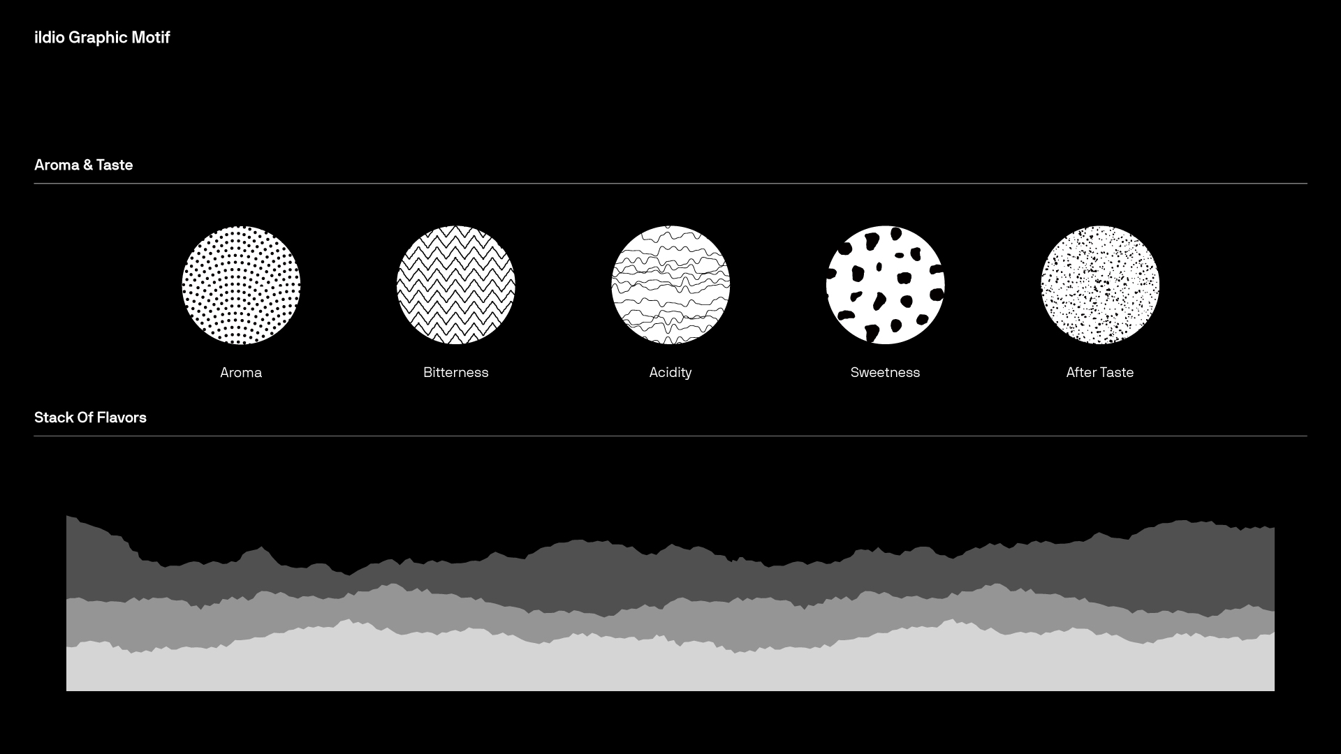 정진서 공간에 브랜드를 그래픽으로 어떻게 녹여낼 수 있을지 고민하며 작업했다. 커피를 위한 노력이 적층된 시간의 흐름과 맛과 향이 번져가는 이미지를 표현하기 위해 켜켜이 쌓인 지층의 형태와 해변 백사장에서 바닷물이 번져가는 형태로부터 그래픽 모티프를 얻어 패턴을 만들었다. 이 패턴들은 커피의 맛을 구성하는 5가지 요소를 광물 입자의 형태를 토대로 디자인해 맛의 정수, 품질과 진정성을 상징했다. 공간의 물리적인 특성과 맞물려 브랜드 그래픽 모티프의 패턴과 연계해 ildio만의 아이덴티티를 드러냈다.