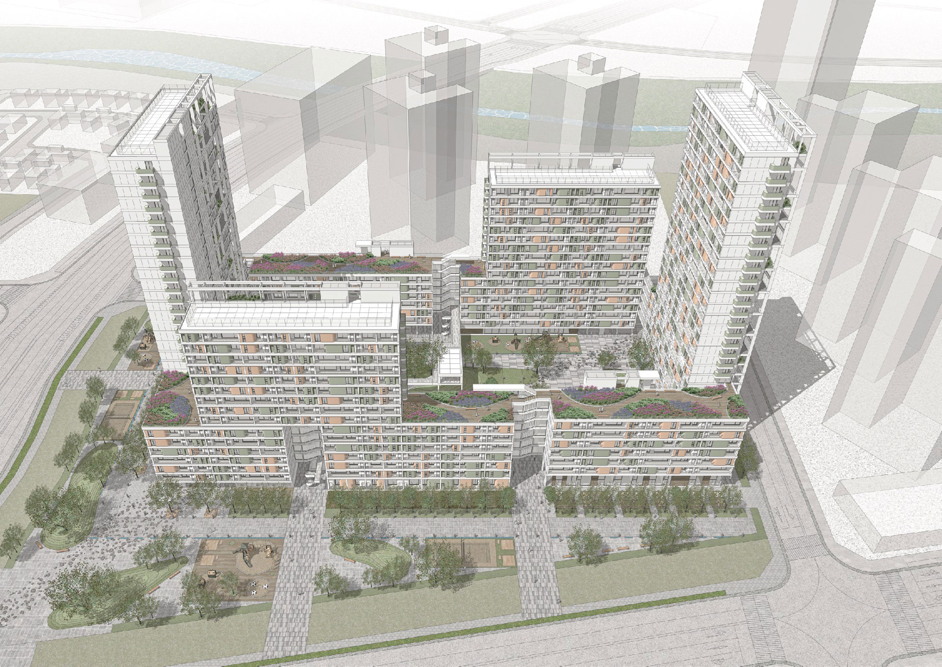 가운데 중정을 둘러싸는 연속된 띠 모양의 연도형 건축물과 그 위로 이어지는 타워들은 하나의 통합된 건축물로 단일 블록을 형성한다. 저층 세대에는 개방 발코니와 확장 발코니를 필수로 제공함으로써 내부 면적 확보와 근지층의 장점 사이에 균형을 맞춘다. 중정을 가로지르는 외부 복도의 교차점에는 공동체 공간이 마련되어 있고, 공동체 활동에 참여하거나 우회하는 선택이 가능하다. 이러한 선택은 시간, 날씨, 계절의 기억과 결합되어 다양한 보행 경험과 다채로운 일상을 제공한다.