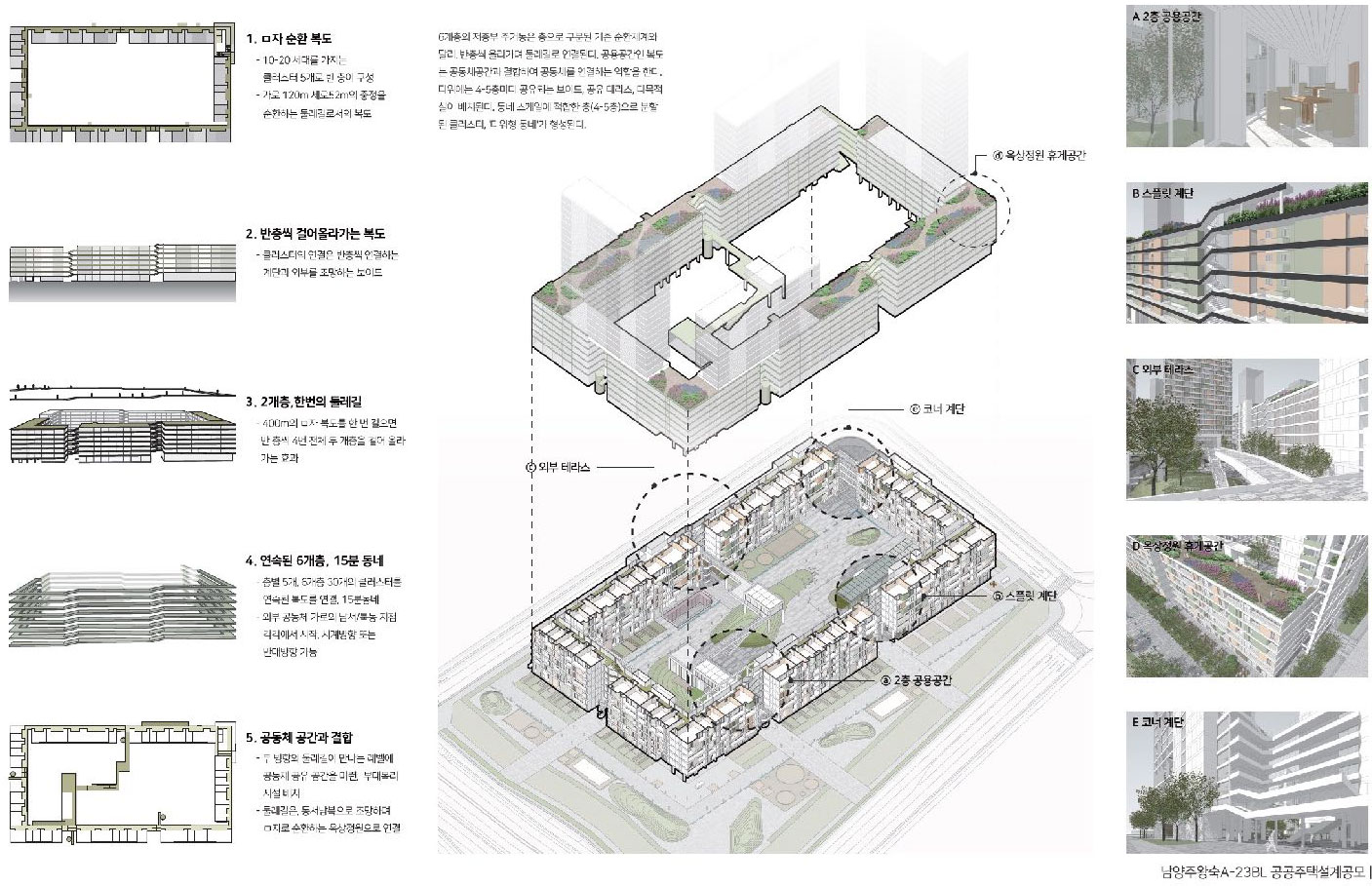 두 번째는 아파트 공용공간을 지속적으로 연구하고 그 설계 기법을 개발하는 노력이다. 공용공간은 세대와 외부를 연결하는 통로로서 안전과 피난이 우선시되지만, 이웃과 만나는 사회적 장소로서의 중요성도 간과할 수 없다. 그러나 보통 비상통로로 구획된 계단은 사용하기 꺼려지고, 효율을 위해 최소화된 엘리베이터와 홀의 내밀함은 오히려 이웃 간 자연스러운 접촉을 어렵게 만든다. 이웃 간 배려와 소통은 적정한 거리와 선택지를 전제로 한다. 복도와 계단실, 혹은 그 결합 가능성에 대한 탐색이 필요한 이유다.