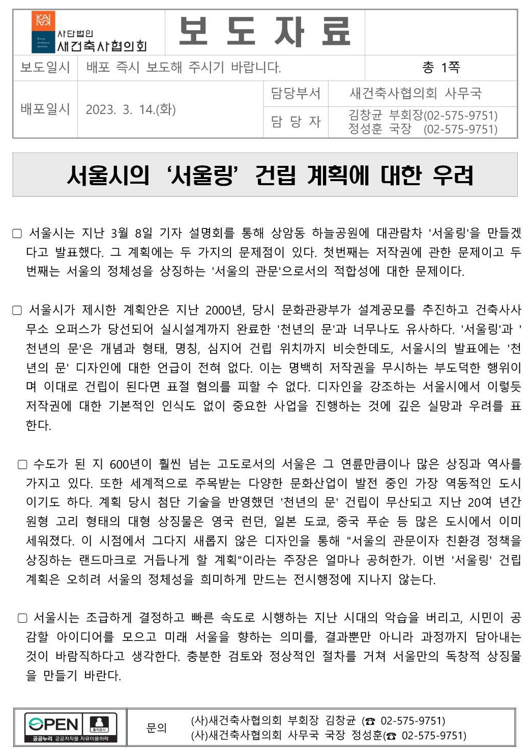 임형남 서울링에 관해서 우리(새건협)가 3월 14일에 입장문을 발표했다. 그때 분개한 것은 서울시라는 인구 천만 대도시의 수장이 문화 서울을 주장하면서도 기본적으로 저작권에 대한 개념이 전혀 없다는 점이었다. 문화는 기본적으로 저작권을 갖는 창작자의 권리를 보장하고, 귀 기울이고, 존중하는 것에서부터 시작되는 것이다. 그런 것 없이 표절이다 아니다를 가지고 이야기하는 것을 문화라고 칭할 수는 없다. 표절인지 아닌지를 차치하고도 기본적으로 원래 있었던 것에 대한 얘기가 전혀 없었다. 그것을 참고했다든지, 이런 프로젝트가 있었다는 것을 먼저 언급했다면 문제 삼지 않았을지 모른다. 여태까지 우리 건축계나 창작하는 사람들을 기본적으로 약자로 봐왔던 것이다. 이것은 매우 큰 문제고, 지금 우리나라의 여러 위상에 맞지 않는 후진적인 작태다.