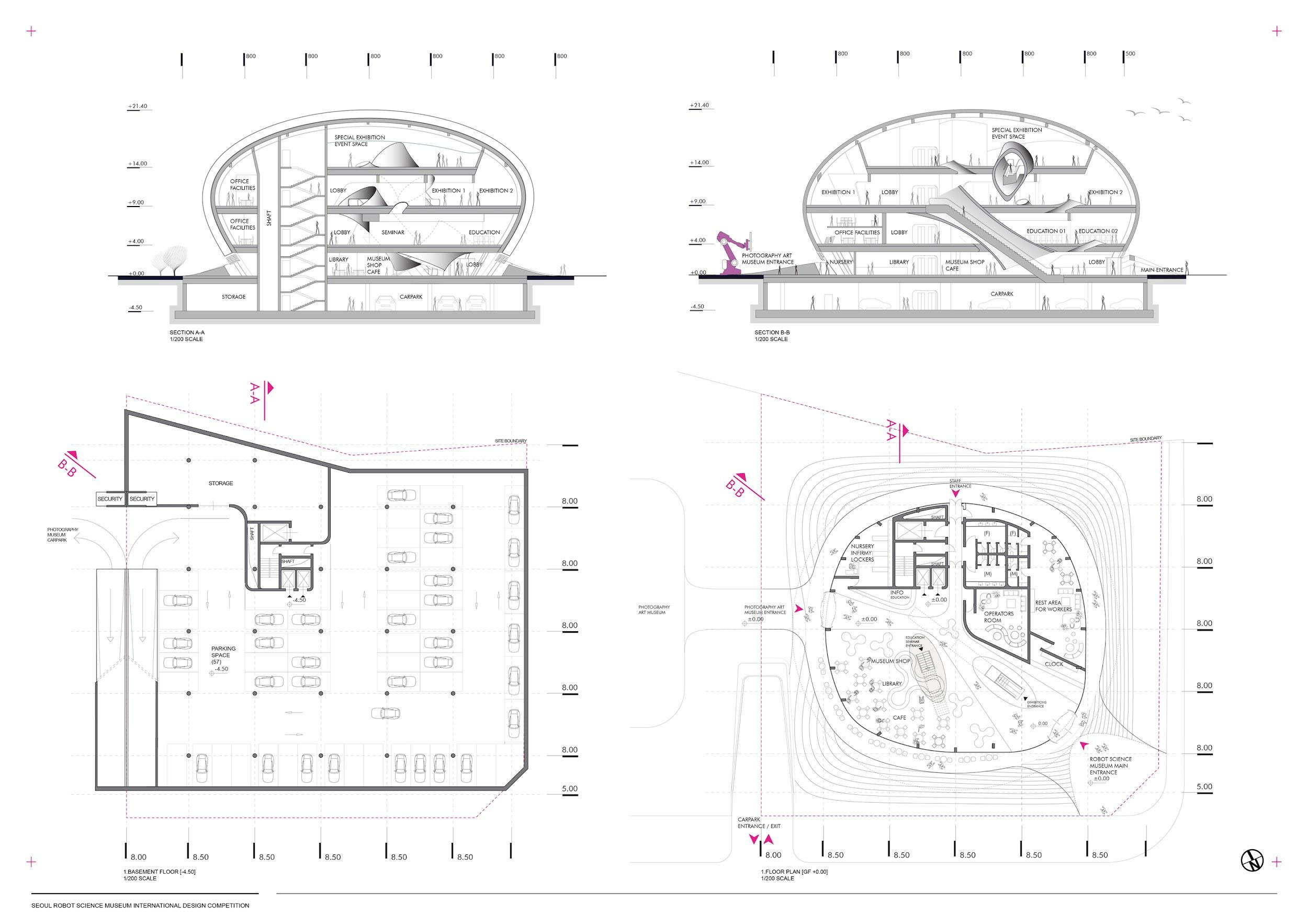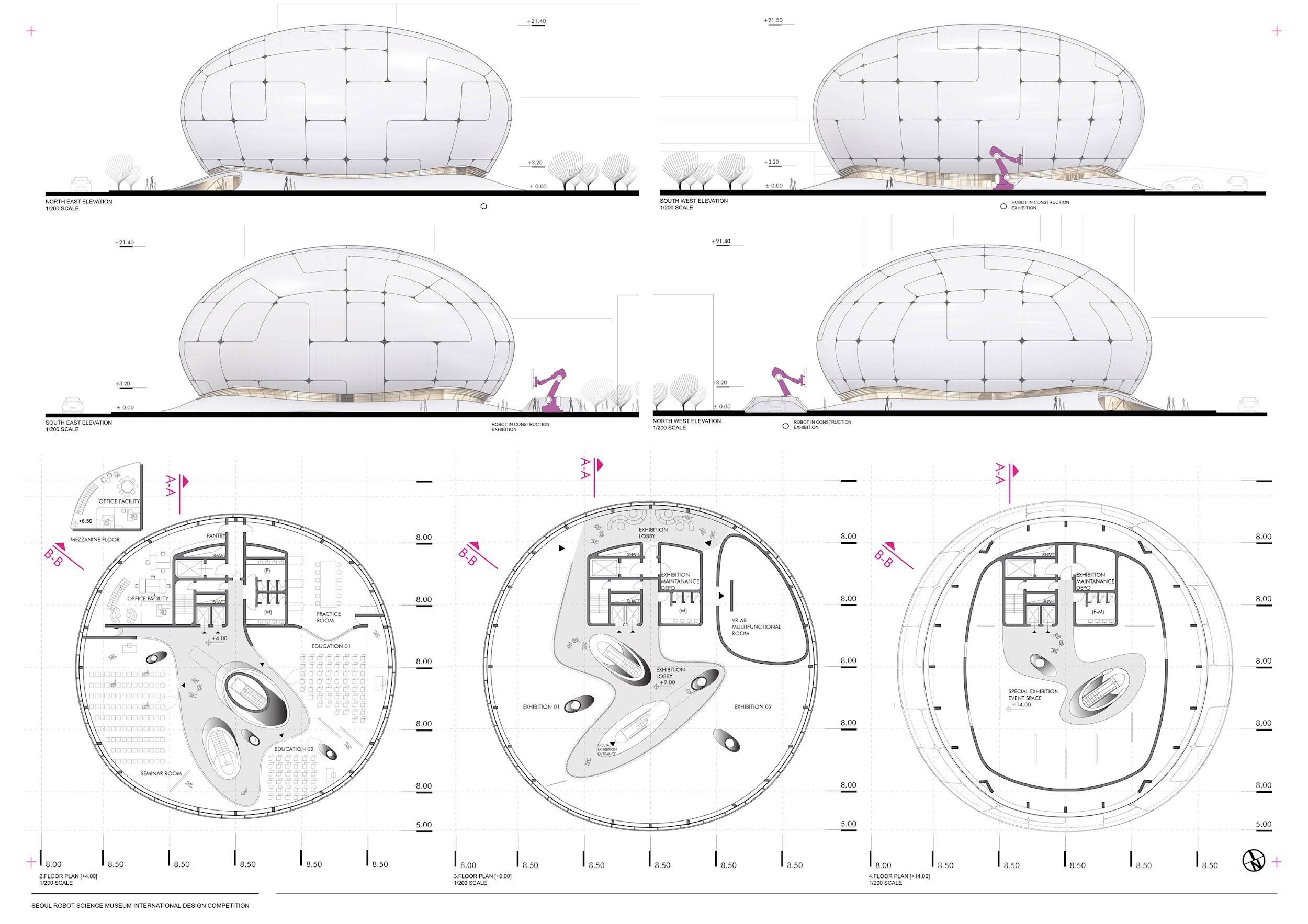 권혁찬  당선안의 투시도를 보면 따로 설명이 필요 없는, 매우 직관적인 형상의 건축물이다. 흐르는 듯한 곡선 형상의 콘크리트 구조물이 비방향성의 구 형상의 본건물을 감싸고 가로변의 시선을 장악한다. 공간 프로그램과 내부 동선은 간단하다. 1층의 오픈 라운지 공간에서 계단으로 이어지는 2층에는 세미나 및 교육 시설이 있으며, 3, 4층은 연속된 전시 공간으로 구성되어 있다. 1층에서 시작된 에스컬레이터는 튜브 형태로 3층까지 연결된다. 연속된 전시 동선은 AR 및 VR 룸과 연결되고, 다시 에스컬레이터를 타고 4층으로 이동하면 천장고가 높은 기획 전시 공간이 나타난다. 이 공간은 마치 공중에 떠 있는 것처럼 바닥 슬라브를 지지하는 구조가 없이 디자인되었다.