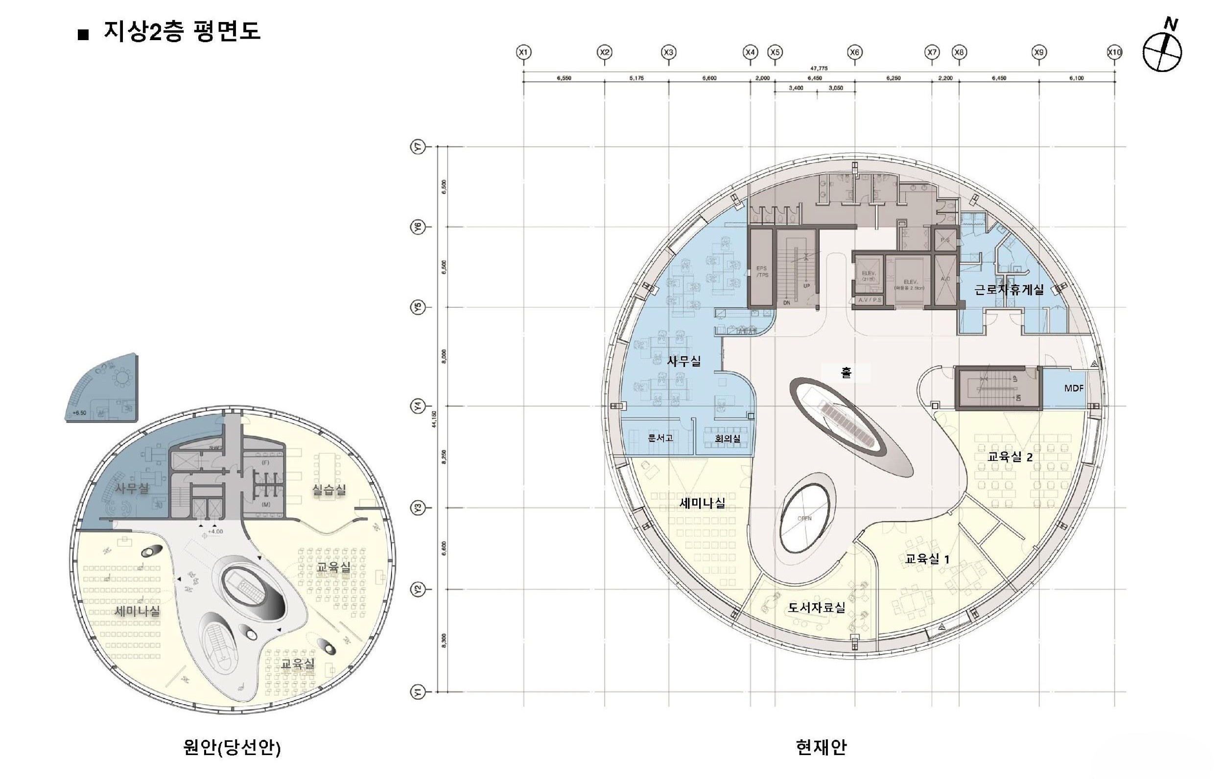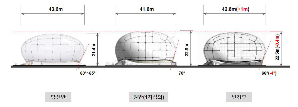 권혁찬  총 두 번의 경관심의가 있었는데, 1차에서는 현상 설계안을 유지하라는 강한 의견과 함께 반려당했다. 유지할 방법에 대한 구체적인 지침은 명확하지 않았다. 원안을 최대한 존중하면서 예산을 고려해 맞춘 것이 1차 수정안이었다. 기능적으로 필요한 엘리베이터의 오버 헤드와 기계실 등을 배치하고 나니 건물이 자꾸 둔탁해져서 디자인을 일부 수정할 수밖에 없었다. 비정형 디자인에서는 하나의 요소를 움직일 때마다 여러 가지 디자인 요소가 연동되어 있으므로 고려해야할사항이 많아 무척 복잡하다. 도저히 이걸 다시 수정할 수가 없어서 심의의원들을 한 명씩 다시 만나 설득했고, 겨우 통과를 받았다.