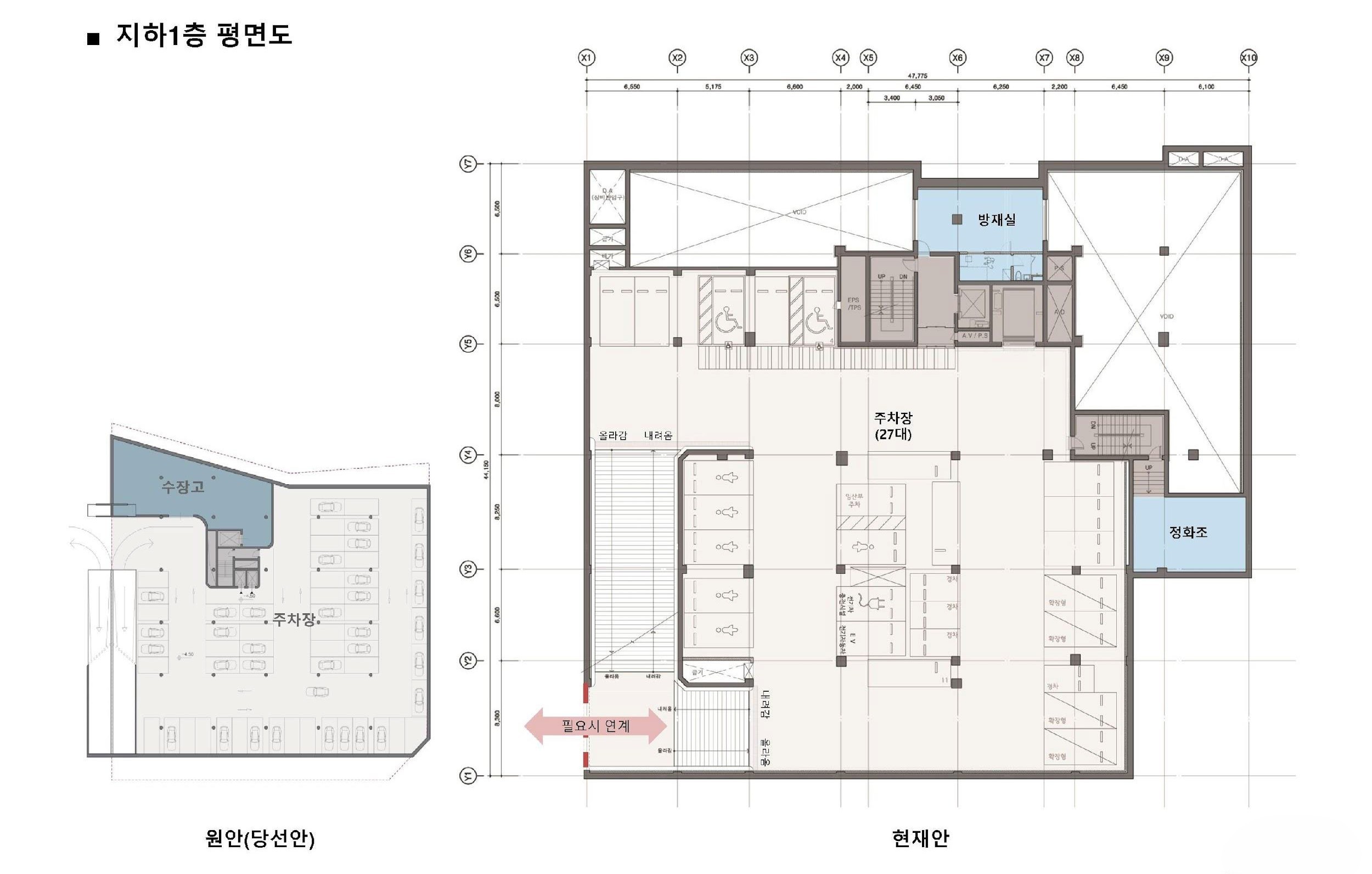 권혁찬  2019년 9월 30일에 설계 용역을 착수했다. 처음에는 멜리케 쪽에서 제공한 도면만을 바탕으로 법규 검토와 문제점을 체크했는데, 여러 문제가 발견했다. 주차장 자리로 하수관이 지나가는 등 중대한 문제를 발견했다. 공모 지침서에도 이러한 상황을 계획에 고려하라는 지침이 있었으나, 공모전 단계에서 실제 고려가 안 되었다. 대상지 땅속이 쓰레기로 가득했는데, 이것을 처리하는 데만도 예상되는 비용이 21억이었다. 기계 전기실이 없었는데, 이것은 현상 설계를 기획한 운영팀의 문제였다. 지하 1층에 기계실을 놓아야 하는데 요구되는 주차 대수를 고려하면 불가능한 면적이었다. 좁은 면적을 최대한 활용하려다 보니 생태 면적도 확보할 수 없었고, 건물은 구 형태로 지붕이 없으니 태양광 설치도 불가능했다. 담당 공무원들은 완고하게 꼭 해야 한다는 입장이었다.
