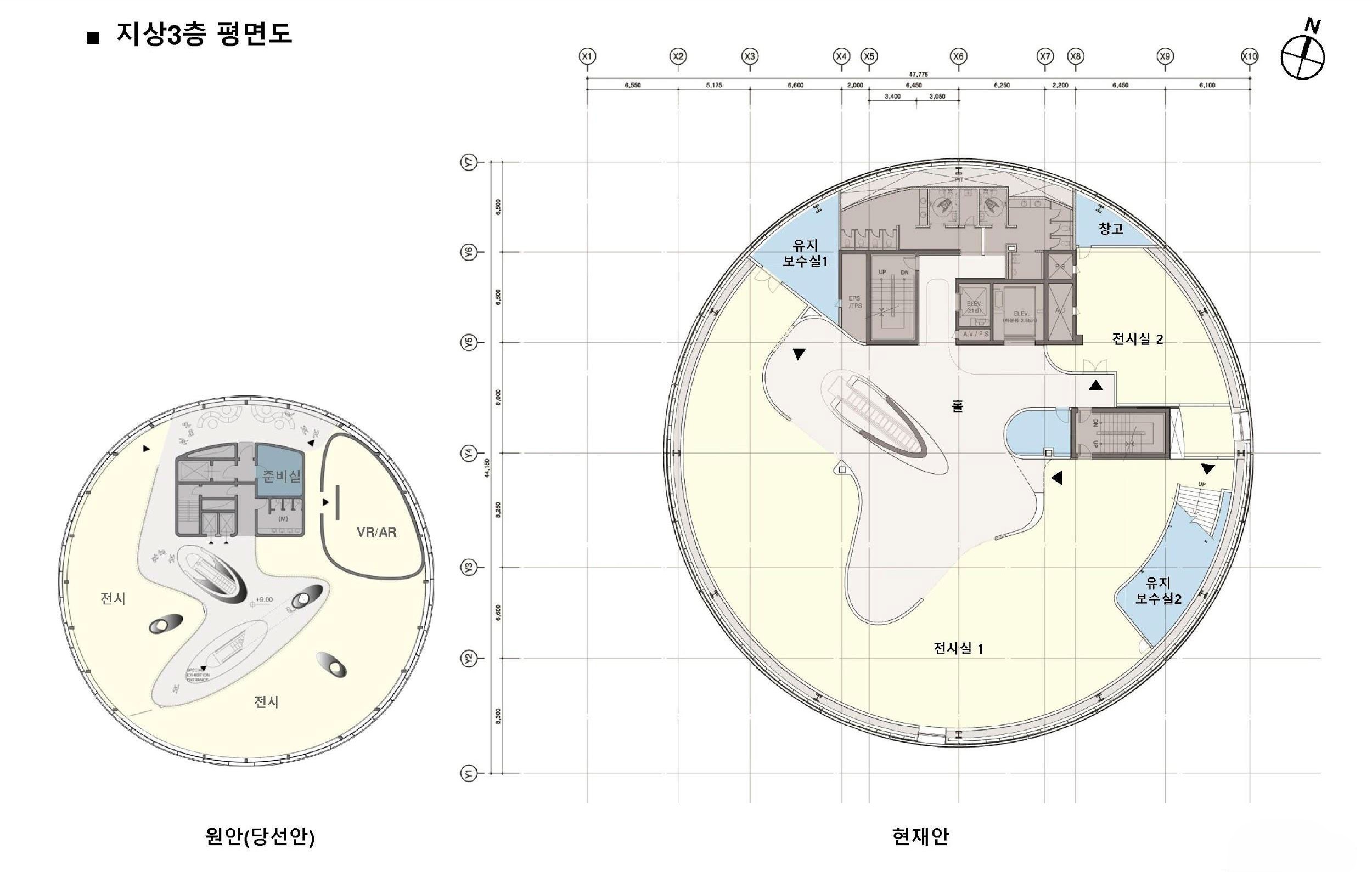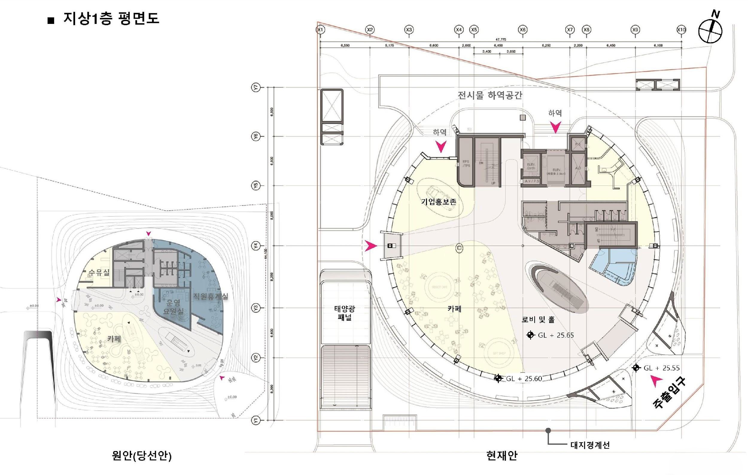 그런데 자세히 계획안을 살펴보면 외국 건축가라는 특수성을 감안하더라도, 계획상 문제가 되는 곳이 너무 많다. 배치도상 계획 요소가 대지 경계를 벗어나 있다. 주차장 부족은 물론이거니와 2천여 평의 과학관 건물에 기계 전기실이 없다. 조경 계획이 고려되지 않아 외부 공간을 전면적으로 조정해서 조경 공간을 만들어야 한다. 1층 평면은 진입 공간 등 필요한 공간들을 억지로 확보하려다 보니 여기저기 들쑥날쑥한 평면이 되었고, 자연스레 1층 외벽을 구성하는 사선의 유리 커튼월은 모두 찌그러진 비정형 곡면이 됐다. 뒤쪽(북측)으로 배치된 코어는 엘리베이터의 높이를 확보하려면 구형의 지붕을 뚫고 나가게 되어 있다. 여기에 피난 계단과 합리적인 복도 폭 확보 등을 하려면 주요 디자인 콘셉트만 남긴 채 기능, 구조, 법규, 시공성 등을 고려해 전면적으로 공간을 재계획해야 한다.