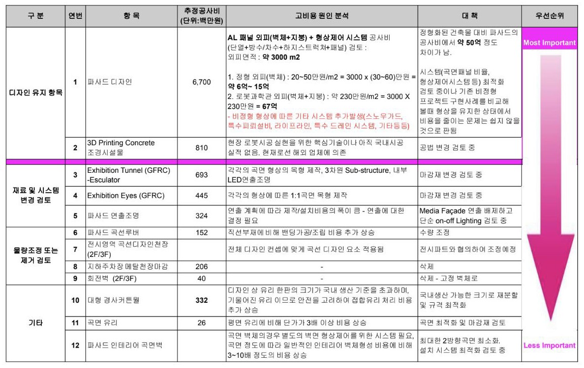 그럼에도 불구하고 예산 절감에 대한 요구는 계속되었기 때문에 어디서 줄여야 할지를 고민했다. 디자인의 경우, 파사드는 상징성이 있기 때문에 변경할 수 없어 그대로 유지하기로 했다. 외부 콘크리트 시설은 3D 프린팅을 활용해 현장에서 시공하려 했으나, 조경 면적 확보, 해외 업체의 터무니 없는 견적, 현실적으로 불가능한 현장 프린팅 규모 등으로 포기하고 다른 대안을 찾기로 했다. 나머지 부분은 소소하게 조정하여, 전체 예산을 80억 줄이는 것을 목표로 했다.