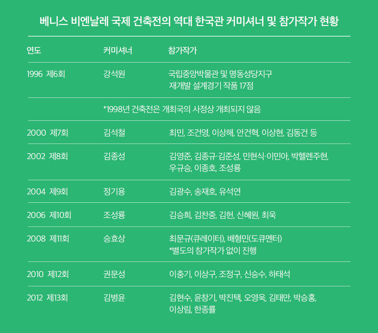 한국문화예술위원회는 2011년 9월 22일 제13회 베니스 비엔날레 건축전 한국관 커미셔너로 대전대학교 건축학과 김병윤 교수를 선정했다. 제13회 베니스 비엔날레 건축전의 총감독은 영국의 데이비드 치퍼필드David Chipperfield가 임명되었고, 건축전의 전시 주제를 ≪공통의 토대Common Ground≫로 정했다. 비엔날레는 주제전과 국가전으로 구성되며 주제전은 주최 측에서 건축가를 선정하여 초청하는 형식으로 진행된다. 국가전은 주제전의 전시와 유기적으로 관계를 형성할 수 있는 전시 주제를 설정하고 각 국가의 커미셔너를 통 하여 해당 국가의 건축가와 건축문화를 알리는 형식으로 구성된다. 이번 비엔날레의 주제 전에는 노먼 포스터Norman Foster(영국), 자하 하디드Zaha Hadid(이라크) 등이 참여하고 우리나라는 승효상 건축가(이로재 대표)가 초청되었다. 한국관의 전시 주제는 ≪건축을 걷다Walk in Architecture≫로, ‘상호작용성’, ‘친 환경성’, ‘장소의 기억’, ‘감각의 구축’, ‘섬세함과 감촉성’이라는 하부 주제를 가진다.