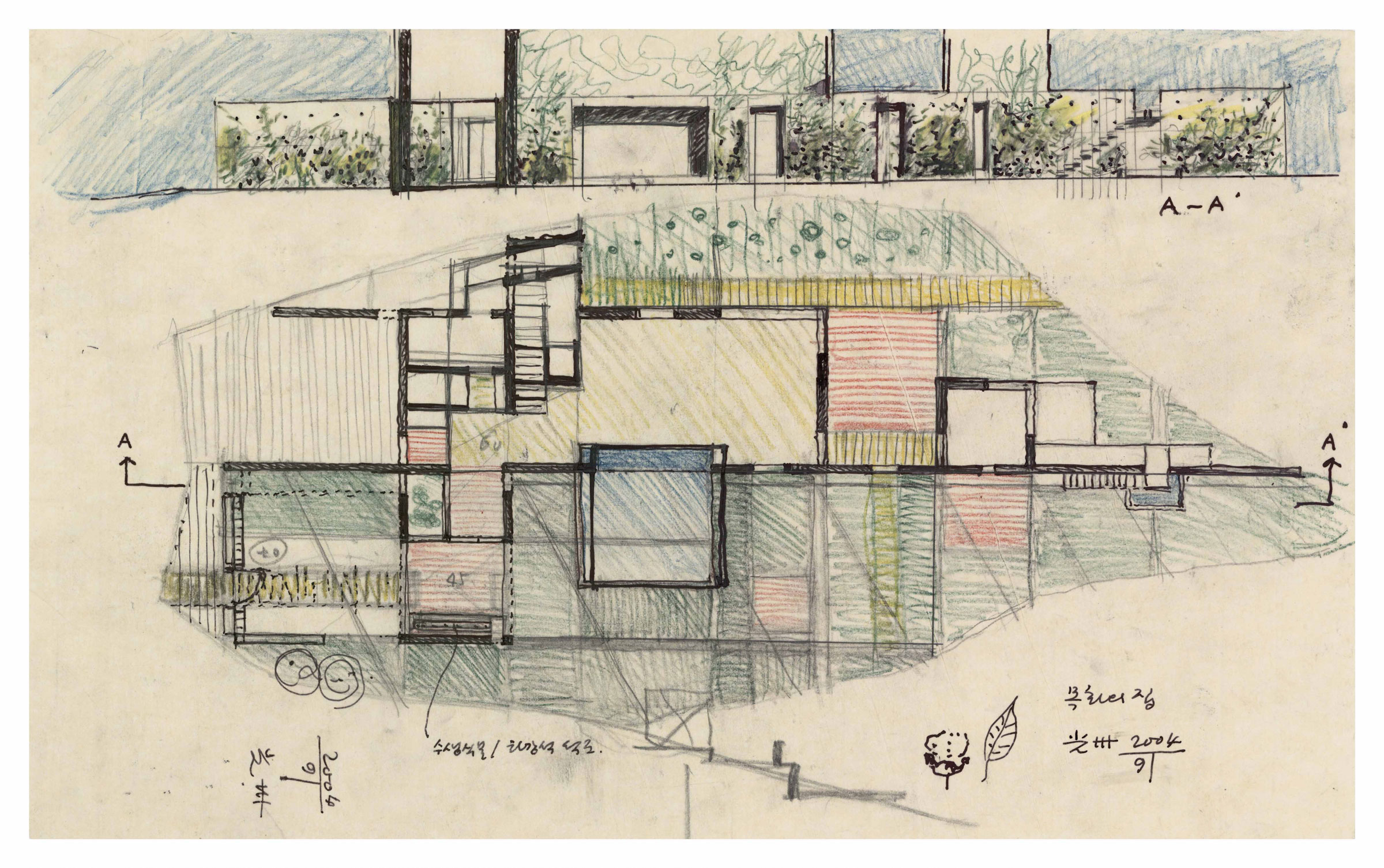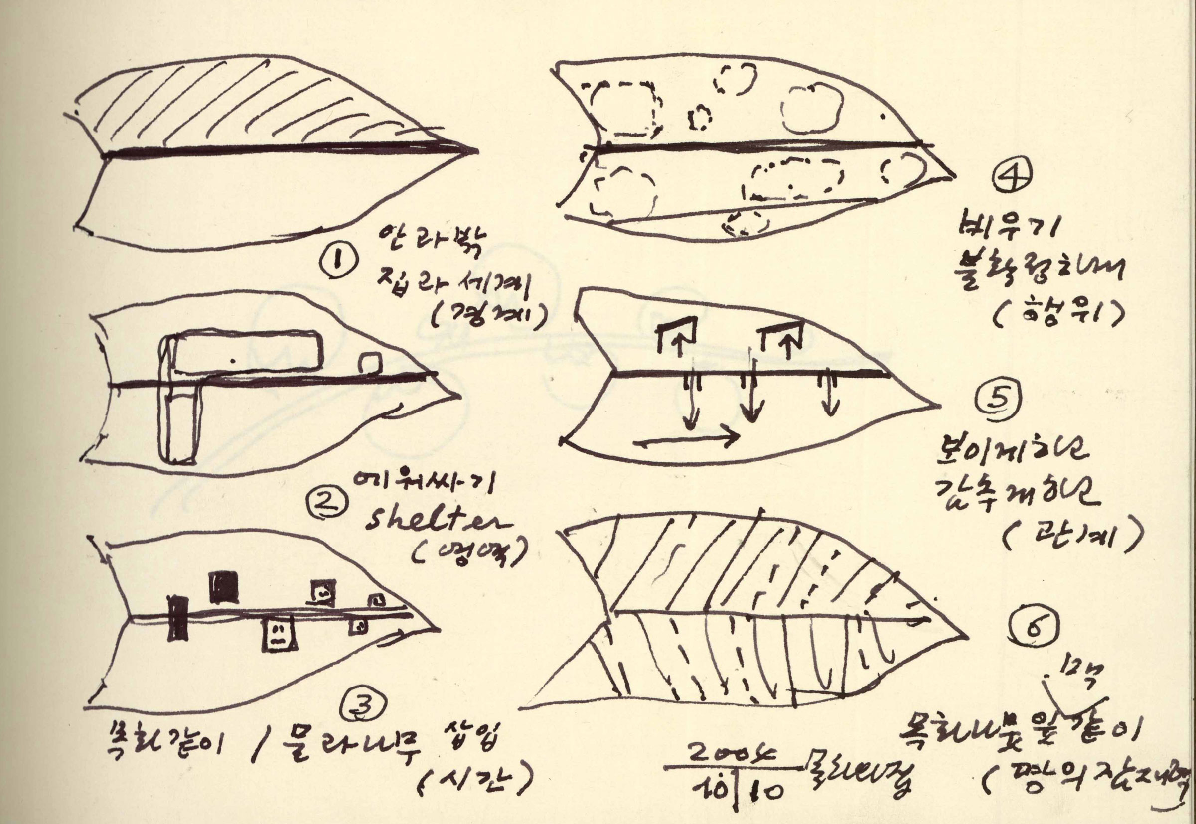 단순히 ‘공공 건축가’, ‘건축계의 공익요원’이라는 명성에 가려 보이지 않았던 그의 다양한 업적과 행보는 아카이브 속에서 발견된다. 예컨대 이번 전시에도 출품되었지만, 정기용의 아카이브에는 <무주 프로젝트>나 <기적의 도서관> 외 초기 인테리어 작업부터 개인 주택, 다가구 주택, 아파트 계획안, 근생시설, 문화시설, 추모시설 등 여러 현실적 조건에서 고민했던 다양한 작업의 갈래가 있다. 한편으로, 그의 건물을 설명하고 그 속에 담긴 의미를 아카이브에서 찾아내는 작업도 가능하다. 그의 건물이 사회적 측면의 업적과는 달리 미학적인 측면에서 성취한 것이 없다는 세간의 지적은 엄청난 자본과 다수의 이해관계자가 개입하는 현대 건축의 진행 과정 속에서 살아남은 미학적 가치란 과연 무엇인지 질문하게 한다. 정기용의 아카이브에는 한 건물이 세워지기까지 건축가가 고민했던 실무적 문제뿐만 아니라 그가 담고 싶었던 건축의 본질적 가치인 땅의 의미, 자연과의 관계, 실존의 문제를 찾아볼 수 있다. 즉 드로잉과 같은 그가 남긴 방대한 자료들은 정기용 건축의 미학적 근원을 탐색케 하는 지점들이다. “건축은 문헌과 독특한 관계를 갖는다. 그 중에 하나는 도면이며 또 하나는 건물이다. 도면은 실현 여부를 떠나서 가상적인 자율성을 갖는 예시와 자기 완결성을 갖는다”6는 설명은 문헌으로 존재하는 아카이브가 정기용 건축을 표상하는 또 다른 실체라는 점에서 중요하다는 것을 뒷받침한다. 건축은 건물 그 자체로 수집될 수 없으며, 그 건물이 만들어지기 까지 사고한 여러 재현의 과정들이 아카이브로 남는다. 주로 옐로우 트레이싱지에 과감한 필치로 그려진 그의 드로잉에는 실제 건축물을 구상하기 위한 도구로서의 드로잉이 아닌 건축가가 건축을 사유한 정신의 흔적 그 자체를 담고 있다. 예컨대 그의 주요 작업 중 하나인 <광주 목화나무의 집> 드로잉의 경우, ‘경계 – 영역 – 시간 -행위 – 관계 – 땅의 잠재력’과 같은 일련의 사고 과정을 통해 건축을 창조하는 그의 작업 방식을 엿볼 수 있다. 드로잉 속 ‘그림’과 함께 곁들여진 ‘글’은 생전 정기용이 “언어는 존재의 집이다”라고 말한 것처럼 단순한 지시어가 아닌 존재를 선언하는 행위인 셈이다.