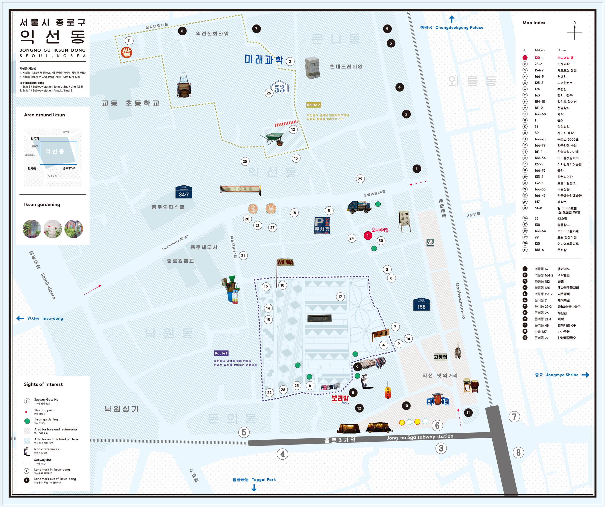 아마추어서울 프로젝트를 통해 다루었던 지역들은 소위 ‘옛날 동네 느낌’이 나는 곳들입니다. 옛것을 좋아해서라기보다는 서울다운 색을 찾다보니 아무래도 오래된 동네 위주로 찾게 되었던 것 같아요. 교남동, 익선동, 원서동을 다뤘습니다. 세 동네 모두 현재 개발을 앞두거나 일부분 진행되고 있는 곳들이죠. 그렇다보니 사라지는 것을 보존하고 지켜내야 하는 이유로 이 프로젝트를 한다고 생각하는 사람들이 더러 있어요. 그런데 이 프로젝트는 그런 목적에 전적으로 의존하고 있다고 할 수 없어요. 있는 그대로의 색채를 잘 보여주는 것이 중요하다는 생각에서 진행하고 있습니다. 아마추어서울을 진행하는 데 있어 첫 번째로 중요하게 이야기하는 것이 있다면 ‘디자이너를 위한 것을 만들지 말자’는 생각입니다. 저희가 만드는 지도를 독립출판물이라고 생각하지 않아요. 단지 지도일 뿐이에요. 지도는 보여줄 것만 보여주지만 그렇다고 해서 담고 있는 내용까지 주관적이라고 하기는 어려워요. ‘정보만 제공하고 의견은 제시하지 않는다’라는 것이 프로젝트와 지도를 제작하는 데 있어 주요하게 기능하는 목표입니다.