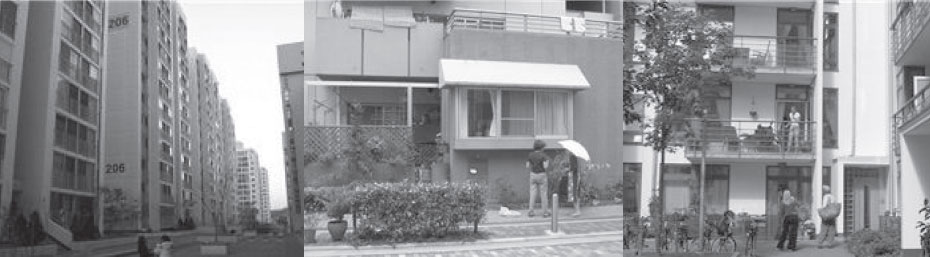 아파트단지가 아무리 소집단화하고 아무리 나무 구조로 갈라져 있다 해도 집집마다 ‘서로 다른 개인들’이 살고 있기는 소필지 지역 단독주택과 마찬가지다. 아파트도 집이고 개인생활의 거점이기는 마찬가지니 말이다. 문제는 한국 아파트에는 서로 다른 개인들의 삶의 모습이 표출될 여지가 없다는 점이다. 엘리베이터를 내리면 굳게 닫힌 똑같은 색깔의 철제 현관문들. 앞집과 우리 집의 차이를 알리는 것은 현관문에 달린 일련번호뿐이다. 밖에서 보는 집의 모습도 마찬가지다. 끝없이 연속되는 똑같은 발코니 샷시들. 밖에서 내 집을 찾으려면 층수 헤아리기를 몇 번이나 다시 해야 한다. 현관 주변이건 발코니이건 삶의 한 귀퉁이나마 밖으로 비집고 나올 여지가 없다. 화분 하나 잡동사니 하나 놓을 곳이 없다. 모든 것은 차가운 현관 철문과 발코니 샷시로 닫혀있다.
