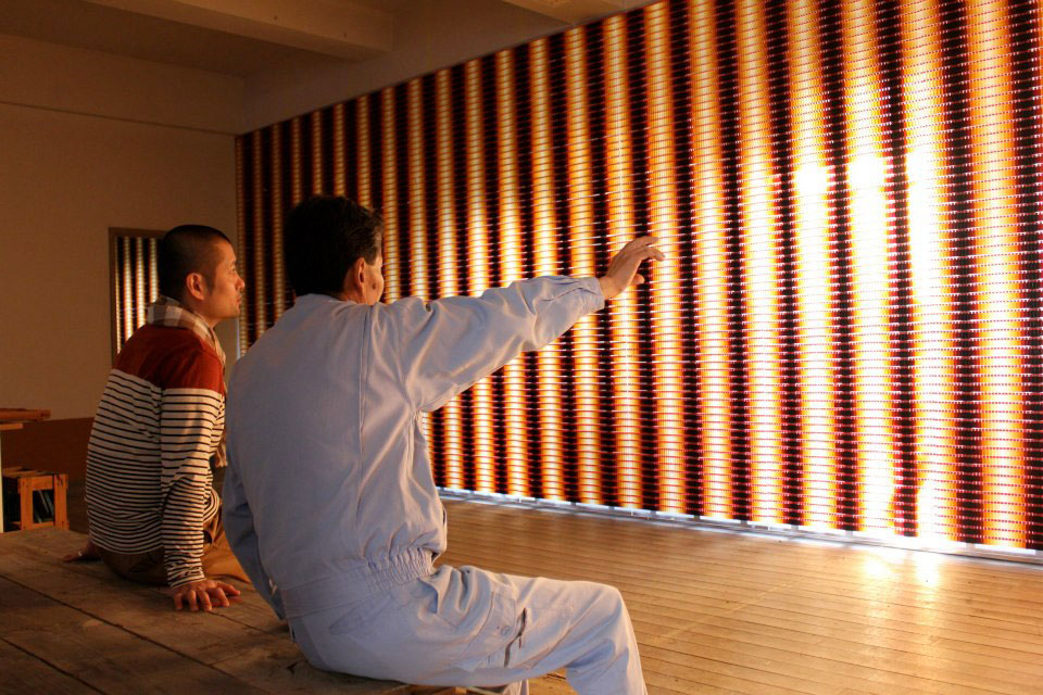 쇼도시마에서의 프로젝트 경우, 2013 세토우치 국제예술제로부터 참가 요청을 받았습니다. 주민들과 무엇을 함께 만드는 과정에서 생성되는 커뮤니티 그 자체를 작품으로 삼아 참가하기로 한 것입니다. 세토우치 섬의 쇼도시마는 간장으로 유명한 지역입니다. 쇼도시마에서 참가를 희망하는 주민 50명을 모집해서 함께 워크숍을 진행했는데, 식사를 하는 가운데 모두 간장병을 형광등에 비추어 간장의 선도를 체크하는 겁니다. 이후 주민들로부터 안 쓰는 물건들을 받았는데 그 과정에서 도시락용으로 쓰이는 작은 간장병 수 천 개가 모이게 되었습니다. 이렇게 모은 간장병에 다양한 농도의 간장을 담았는데 농도를 잘 보이게 할 수 있도록 형광등을 달아 그라데이션을 만들고 벽면에 설치했습니다. 작품 자체도 인기를 끌었지만 작품을 만드는 과정에서 생긴 주민들과의 연계가 진정한 작품이라고 생각합니다.
